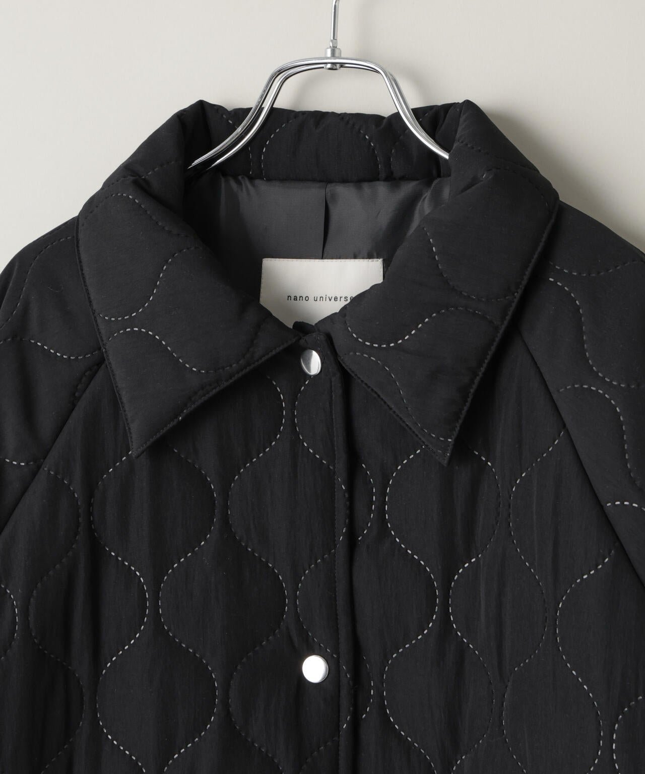 ひょうたん柄の圧着キルトが目を惹く、表情豊かなラグランミドルコート