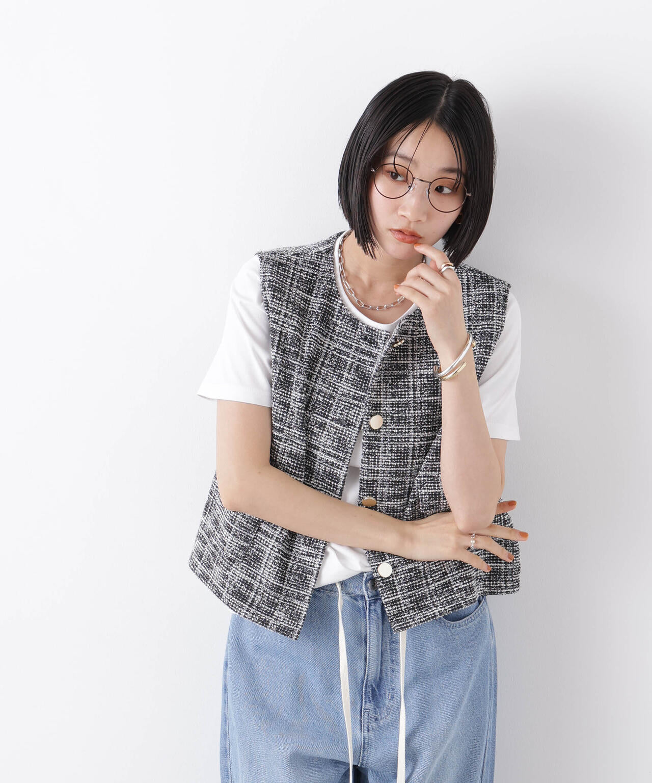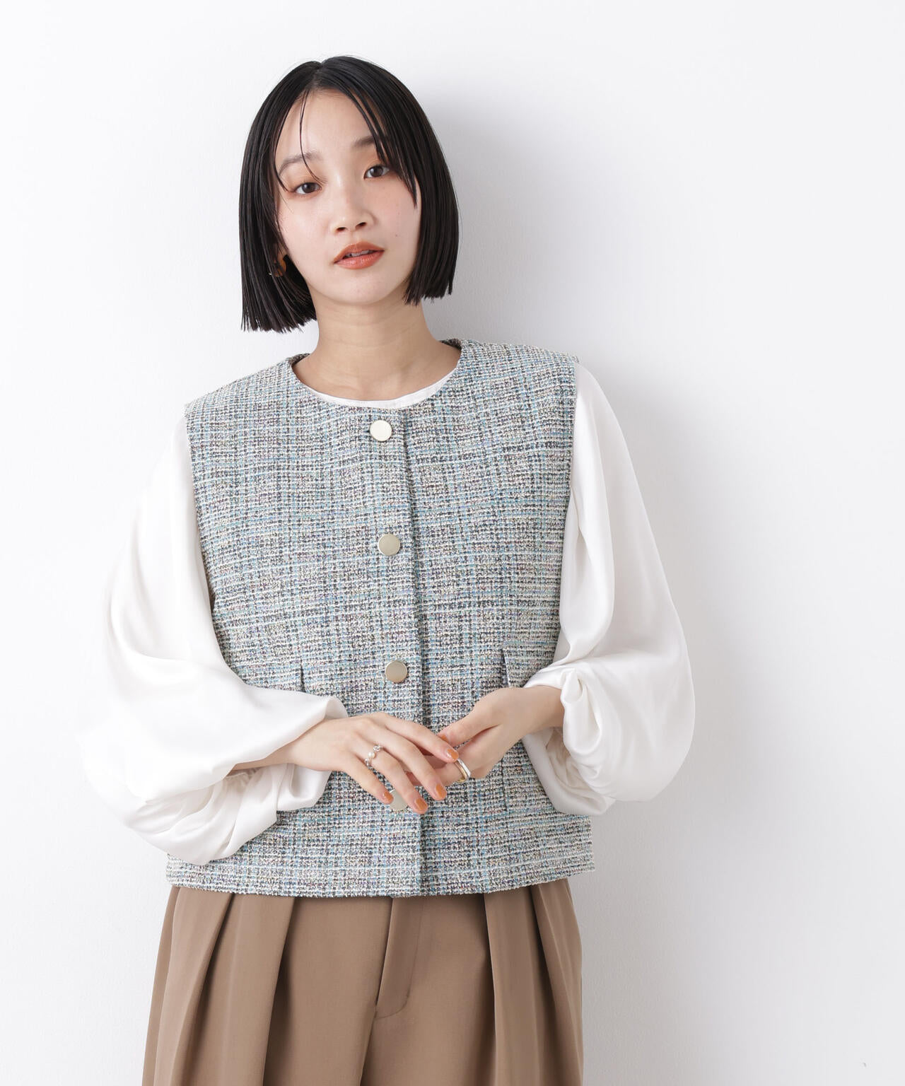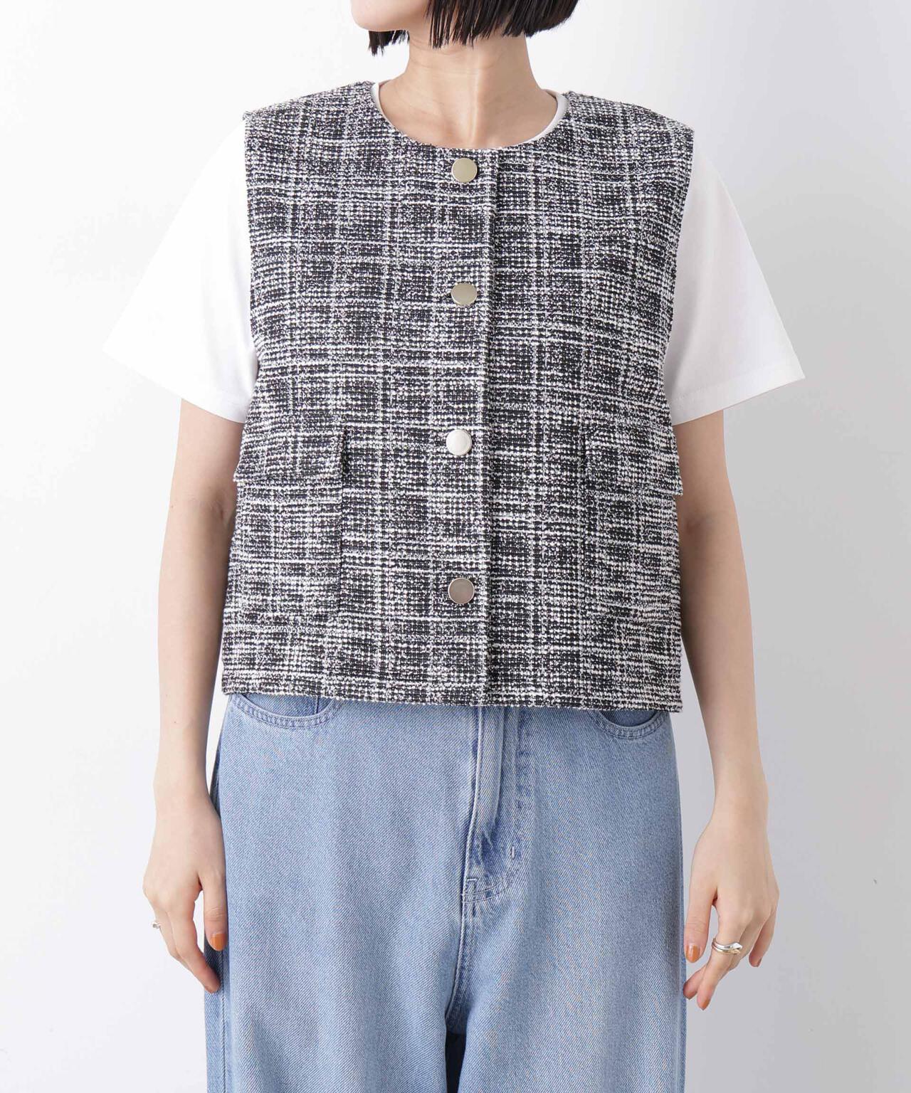 ・ミックスカラー調のツイード織りが華やかで上品な印象のジレトップス