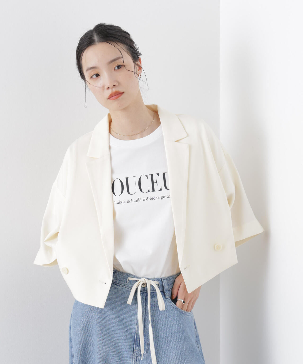 サラっと羽織るだけでこなれ感を演出してくれる、ショート丈ワイドジャケット。程よいサイズ感でどんなボトムにも合わせやすく、デイリーの着回しに活躍します。