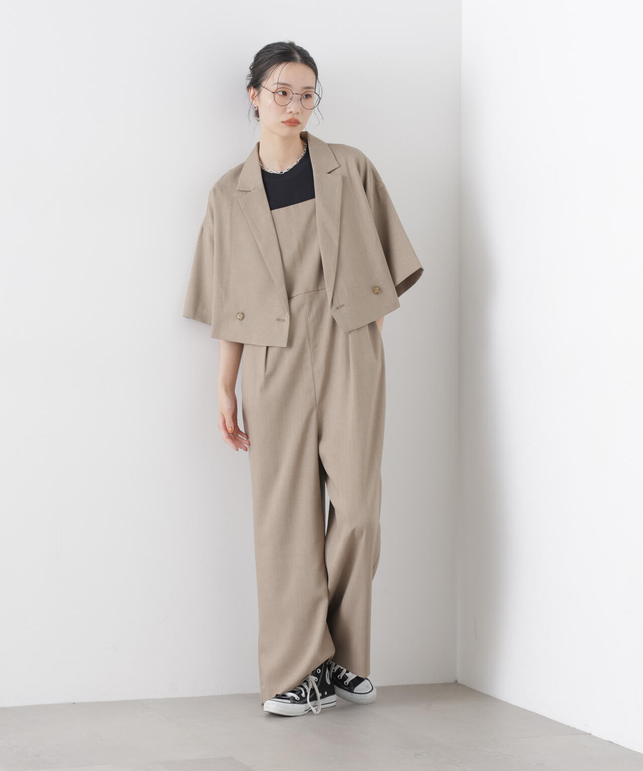 ・同素材のサロペットやパンツと合わせたセットアップスタイルもオススメ