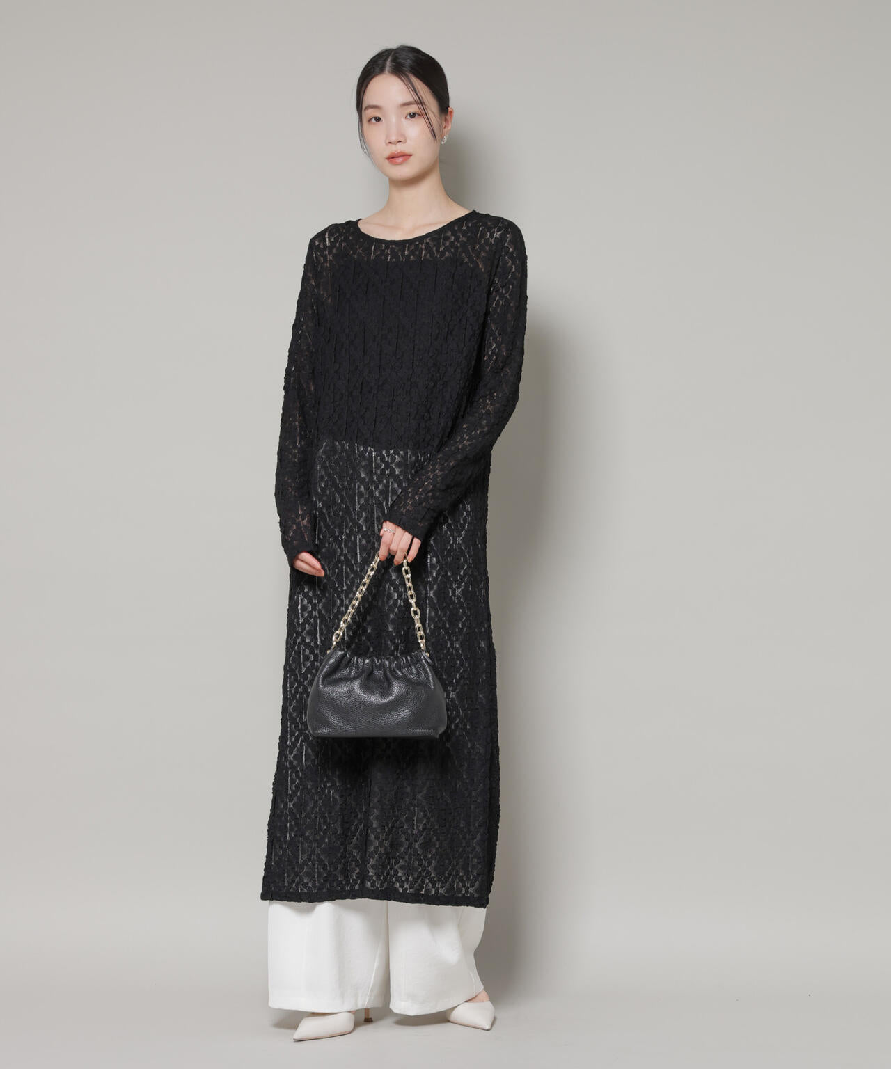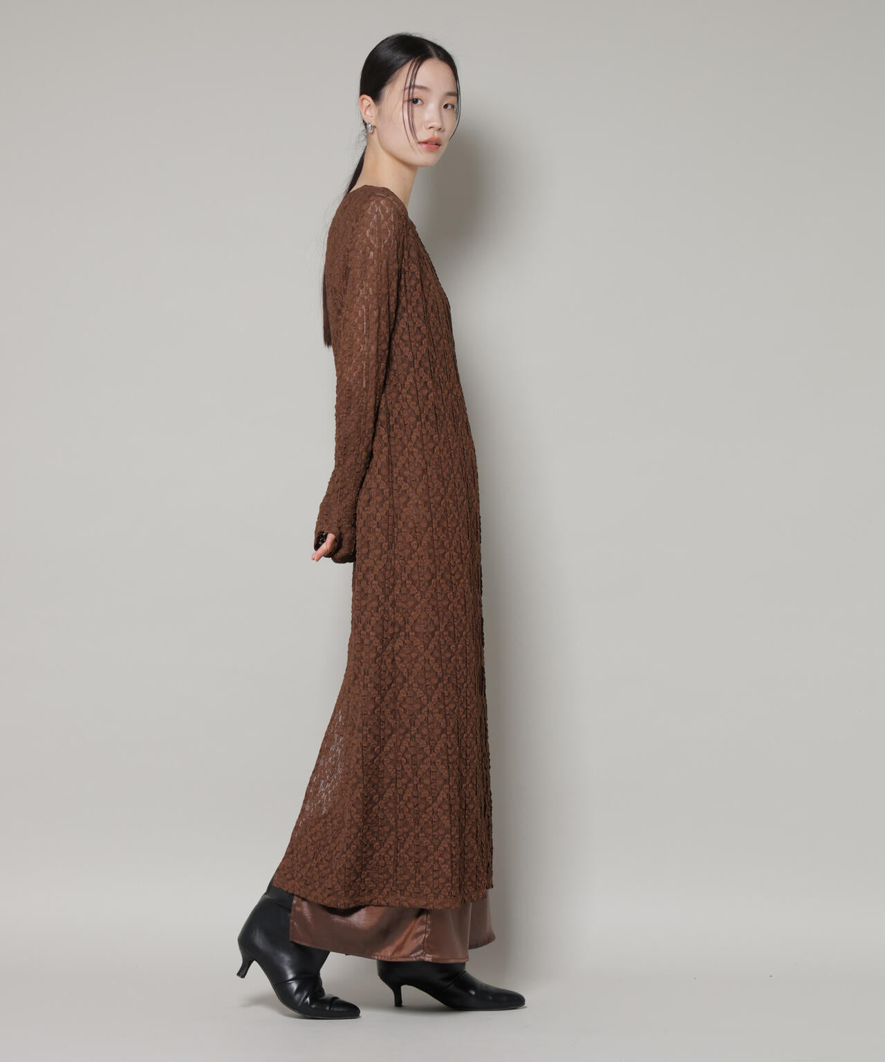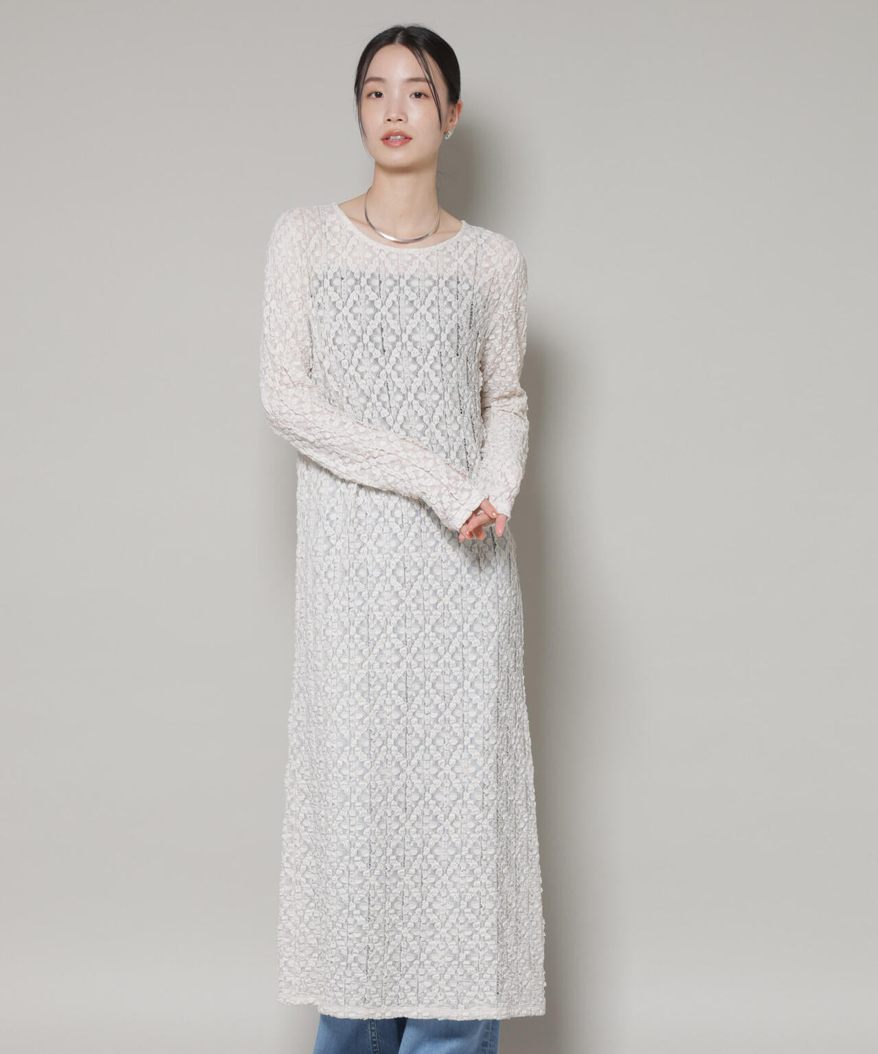 フェミニンなレイヤードスタイルを楽しめるカットレースのマキシワンピース。伸縮性があるので動きやすく、ポコポコした立体感のある素材が華やぎを演出してくれるアイテムです。