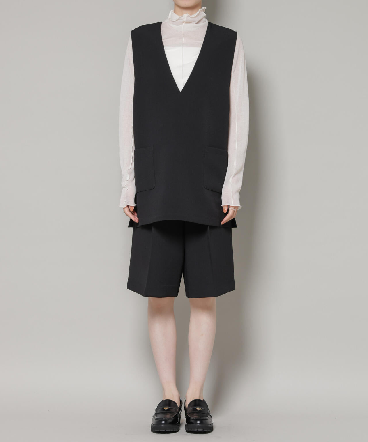 シーズンレスで着回し可能な、Vネックベストとハーフパンツのセットアップ。ベストは深めのVネックとややオーバーサイズで、シャツやTシャツなど様々なインナーと好相性。ハーフパンツは膝上のやや長め丈で、大人の女性も着やすく、セットでも単品でも活躍する万能アイテムです。
