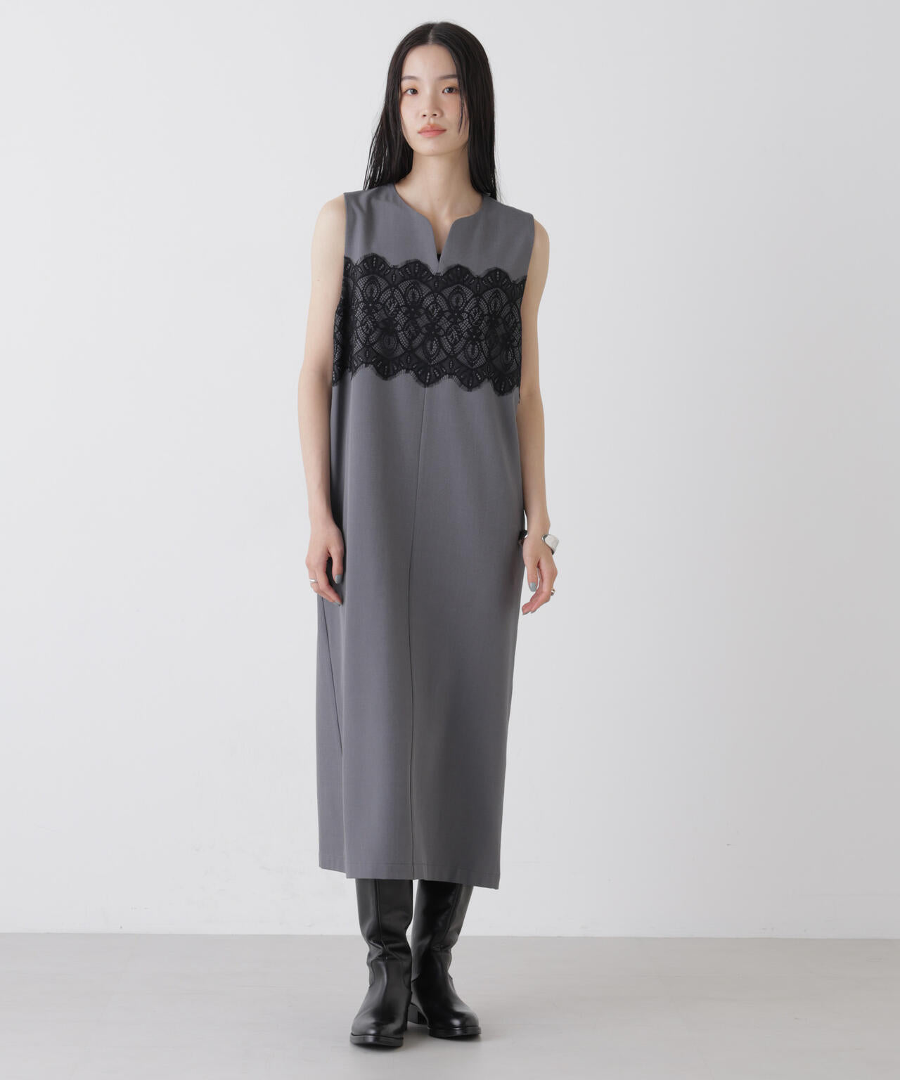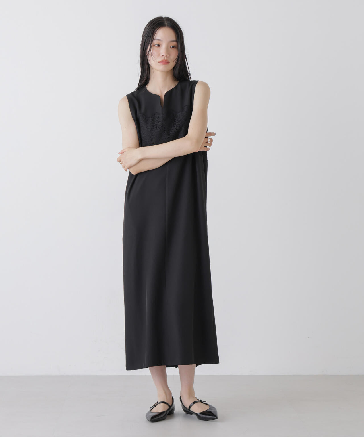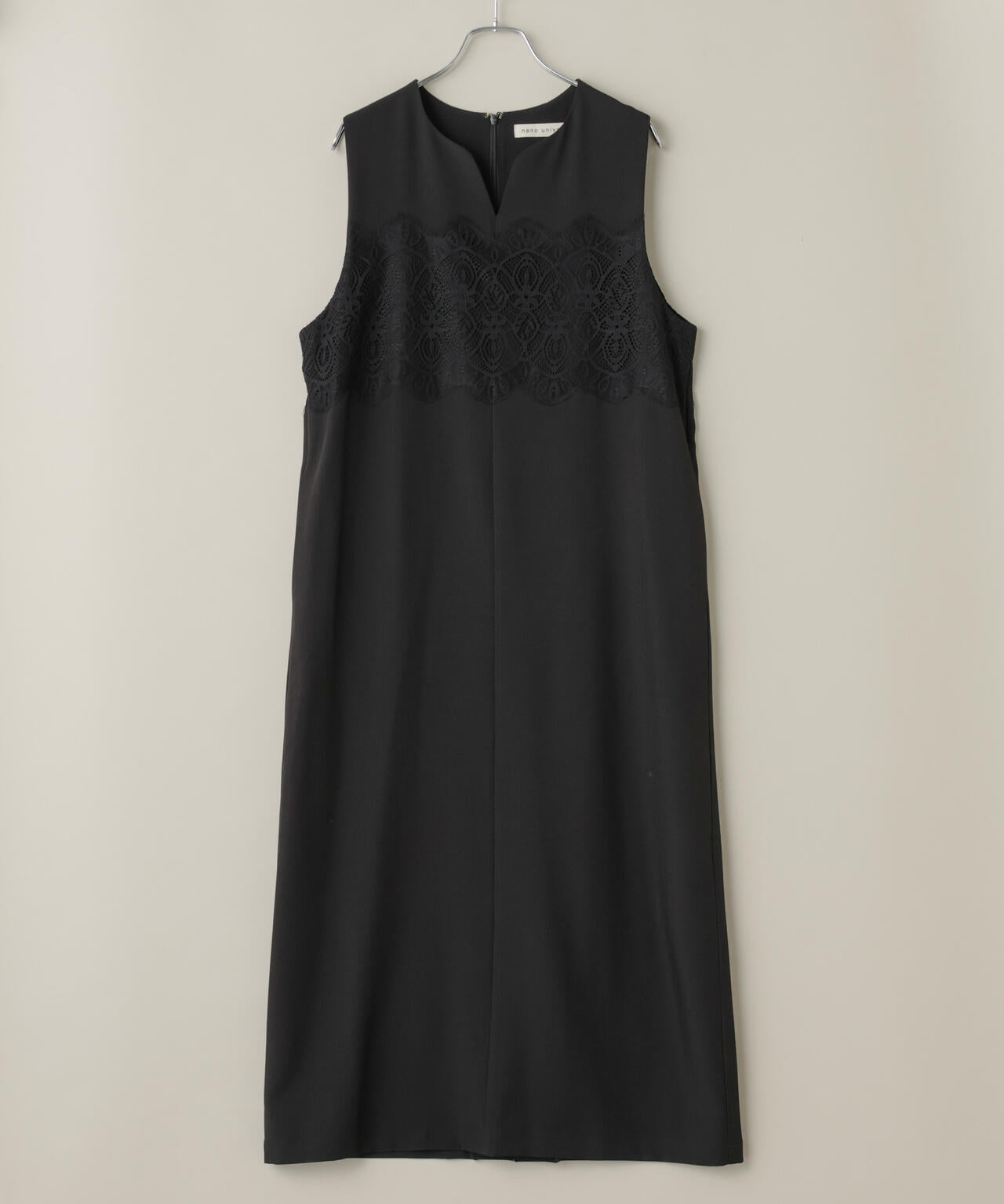 ・胸元を上品なレースで切り替えたシンプルなノースリーブワンピース