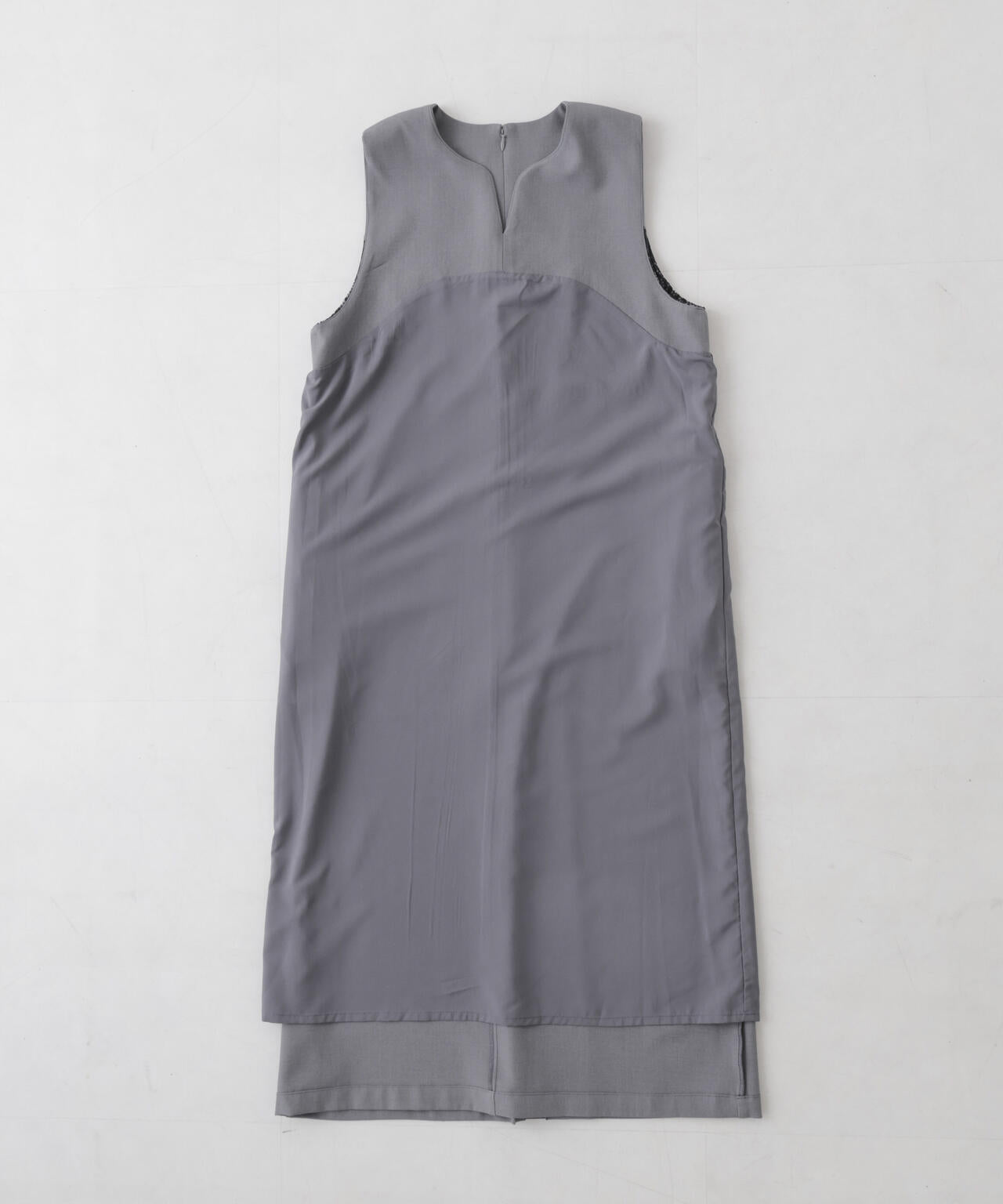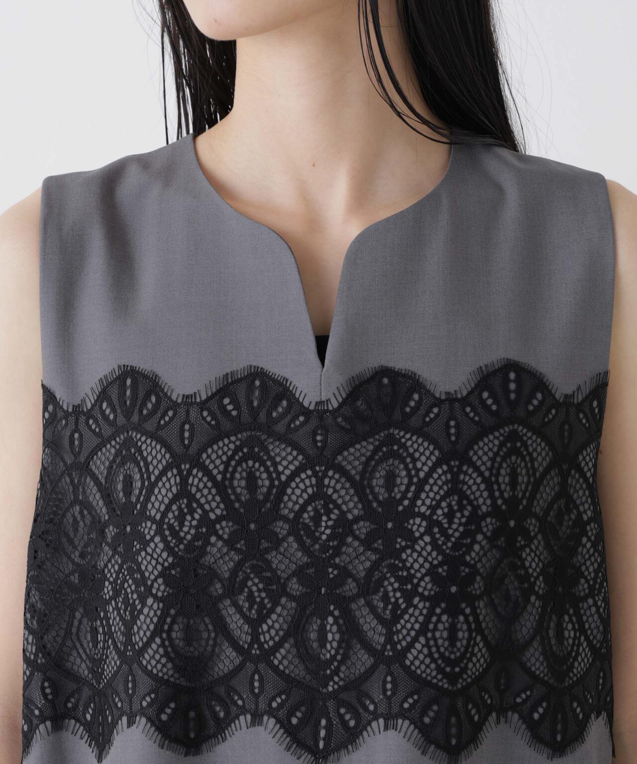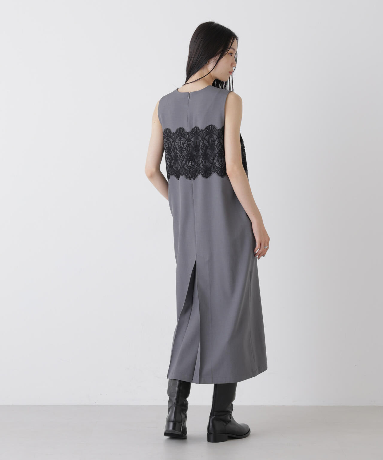 ・胸元を上品なレースで切り替えたシンプルなノースリーブワンピース
