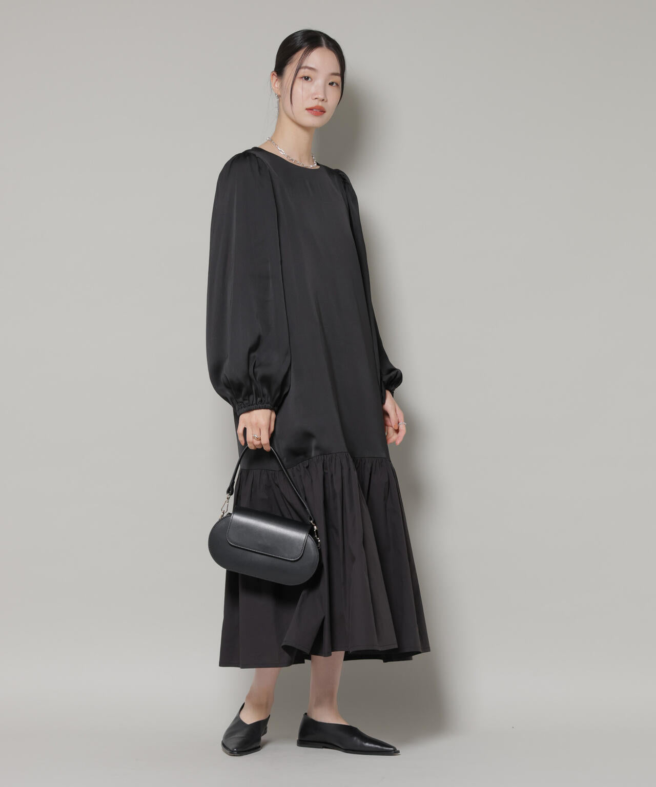 程よく上品な光沢感のサテン素材と、ハリのある素材の異素材コンビ
