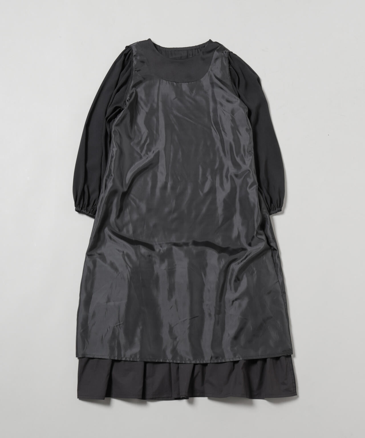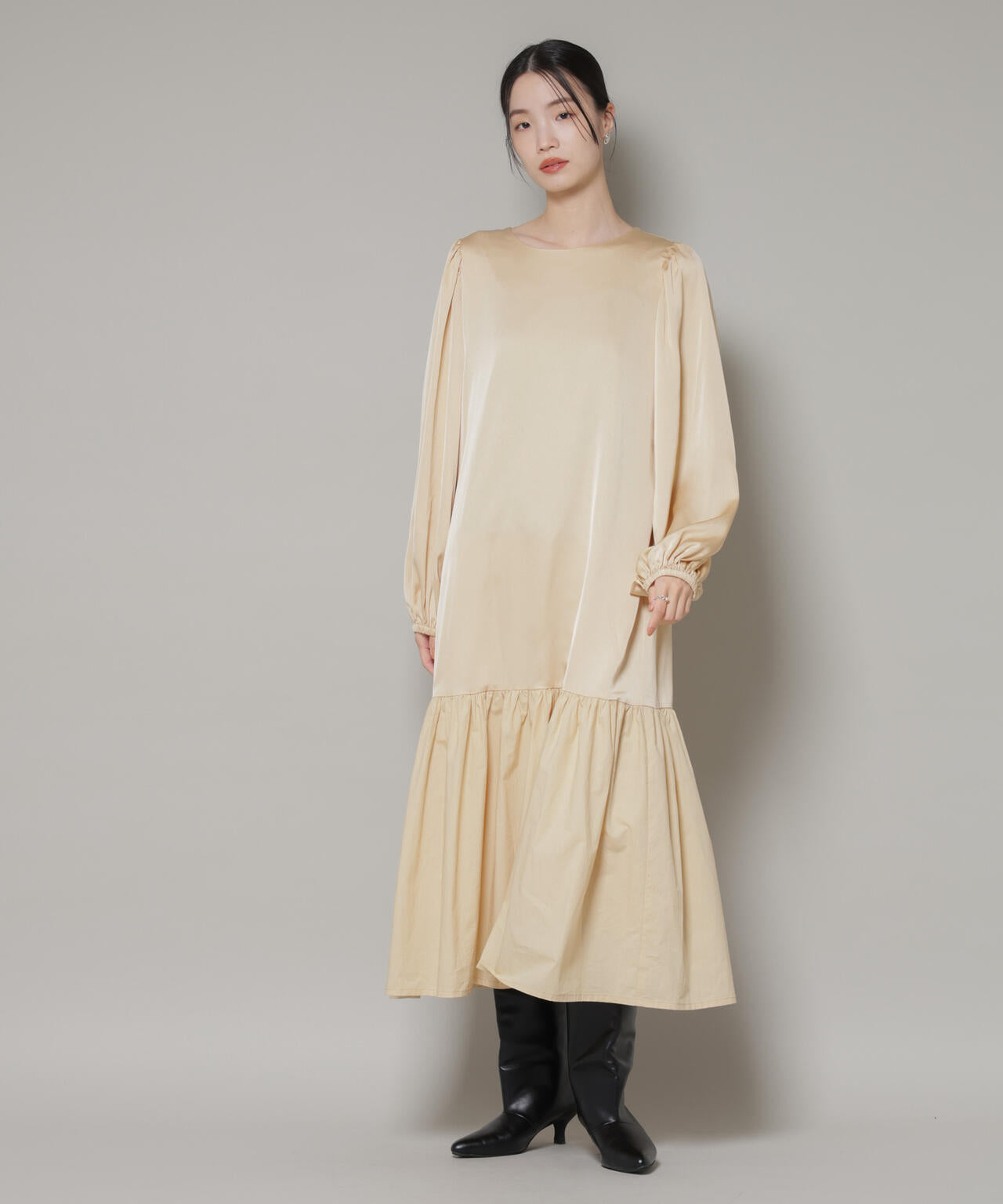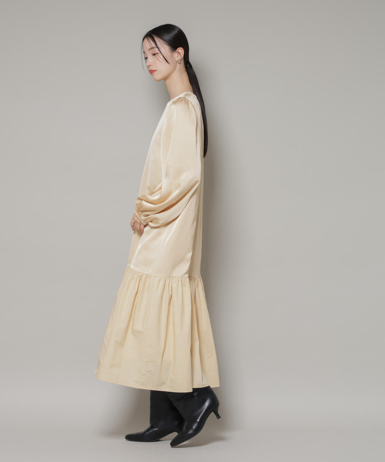 上品な光沢のサテン素材とハリのある素材を組み合わせた、ギャザー切り替えのドッキングワンピース