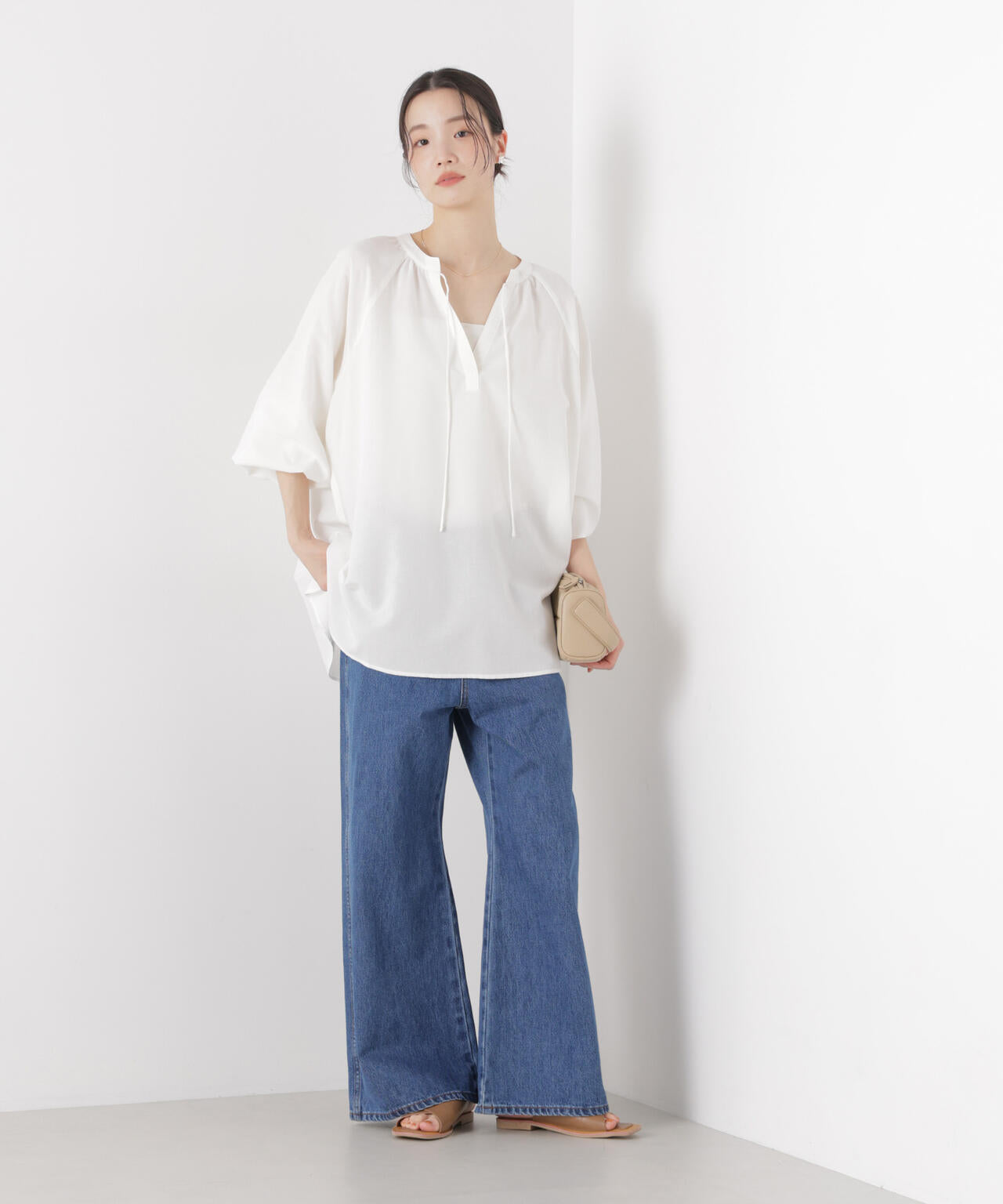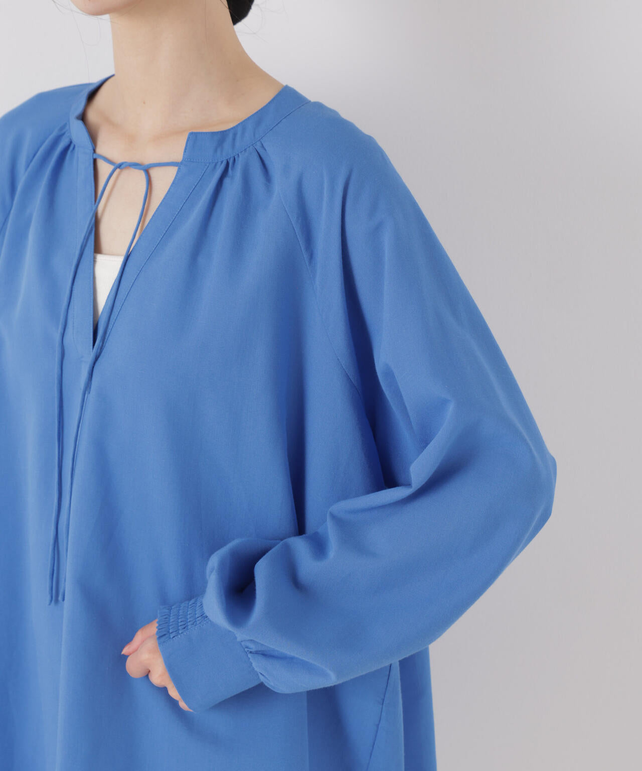 リネン混素材のナチュラルな風合いが魅力のプルオーバーブラウス。洗濯機洗いが可能なイージーケア仕様で、デイリーに取り入れやすいアイテム。ボリューム感のあるドルマンスリーブと、襟元のリボンディテールが大人カジュアルなスタイルにさりげないアクセントを添えてくれる1枚です。