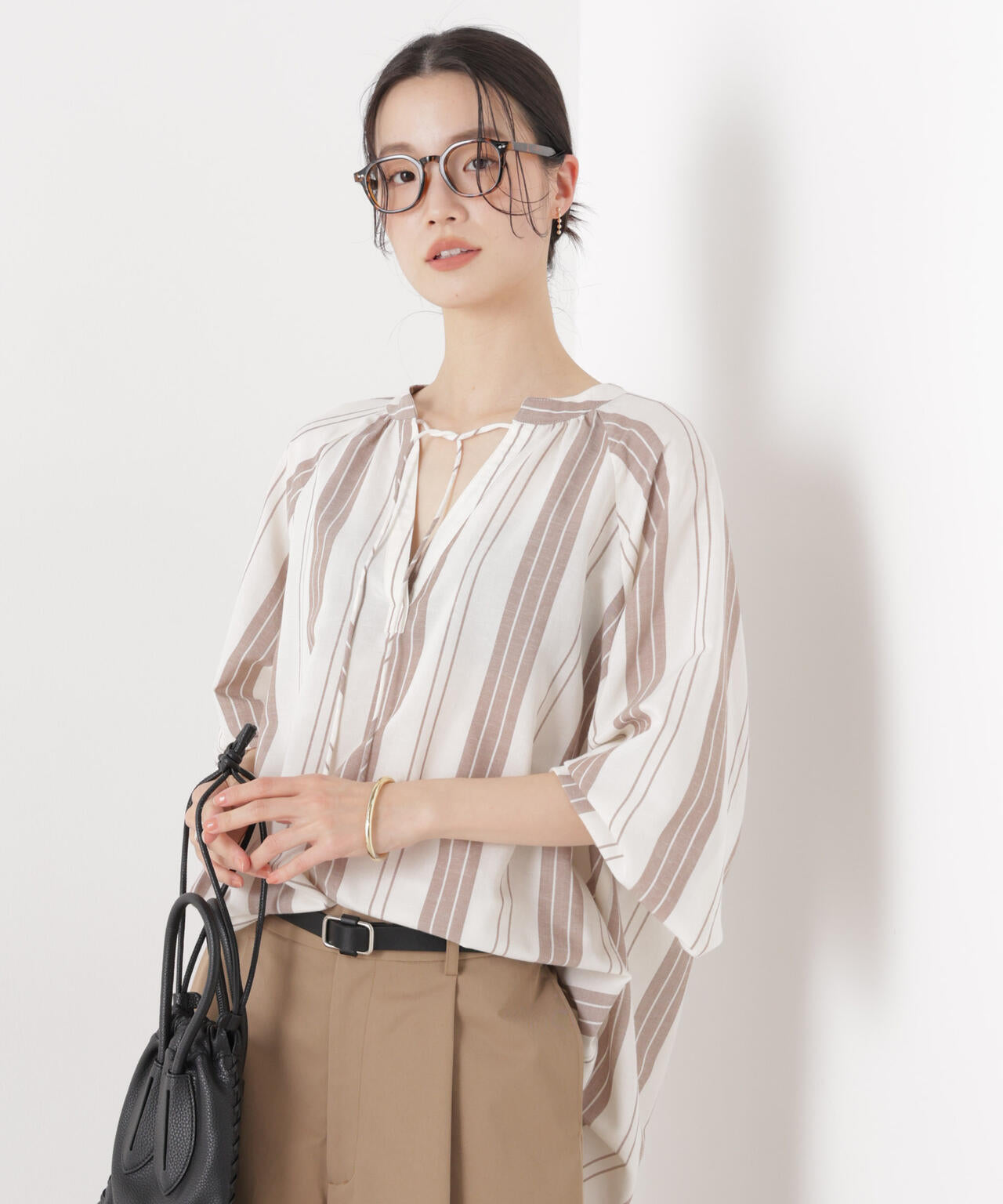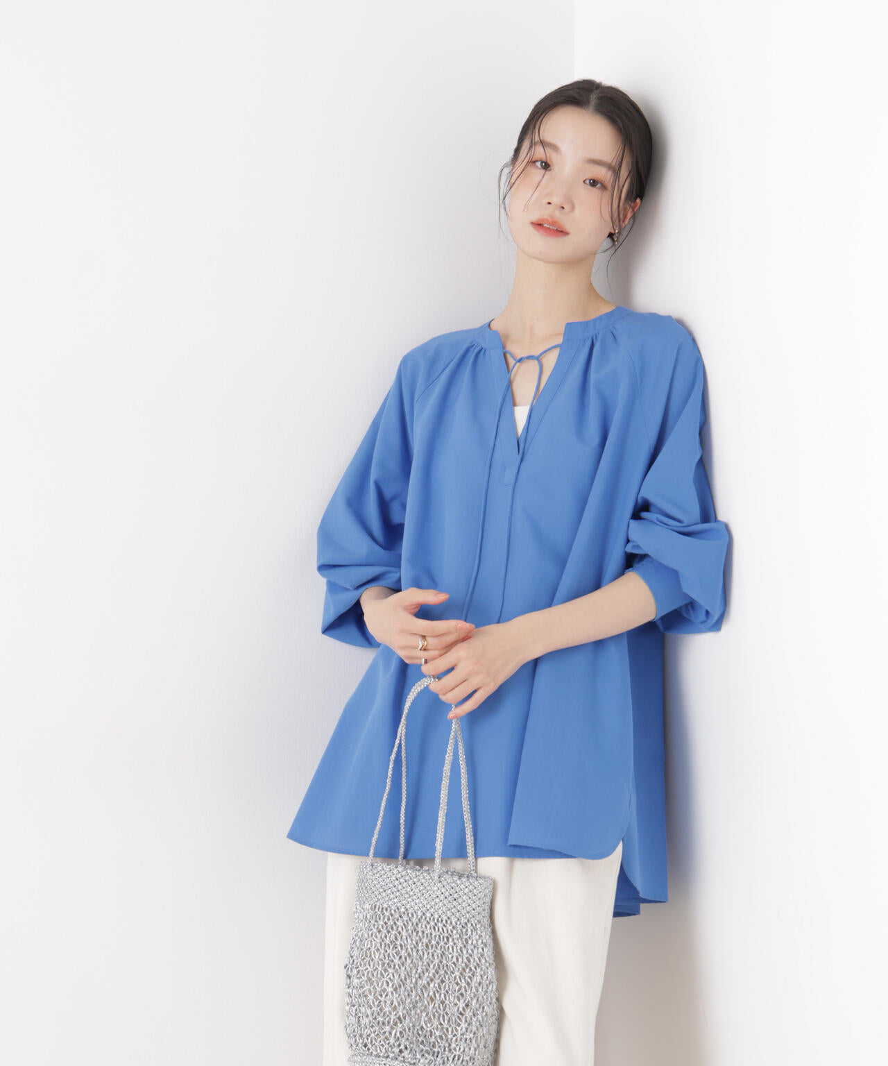 ・襟元のリボンディテールがさりげないアクセント