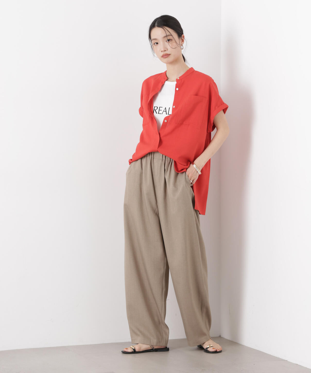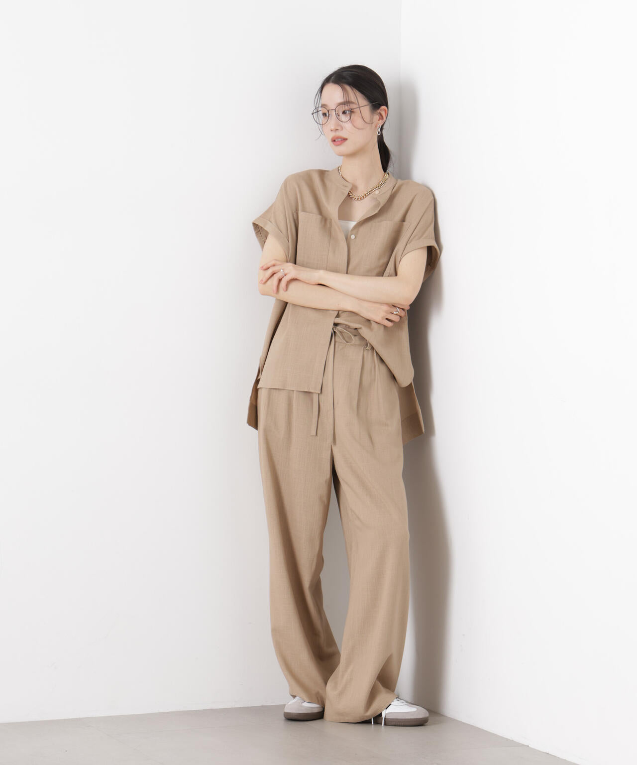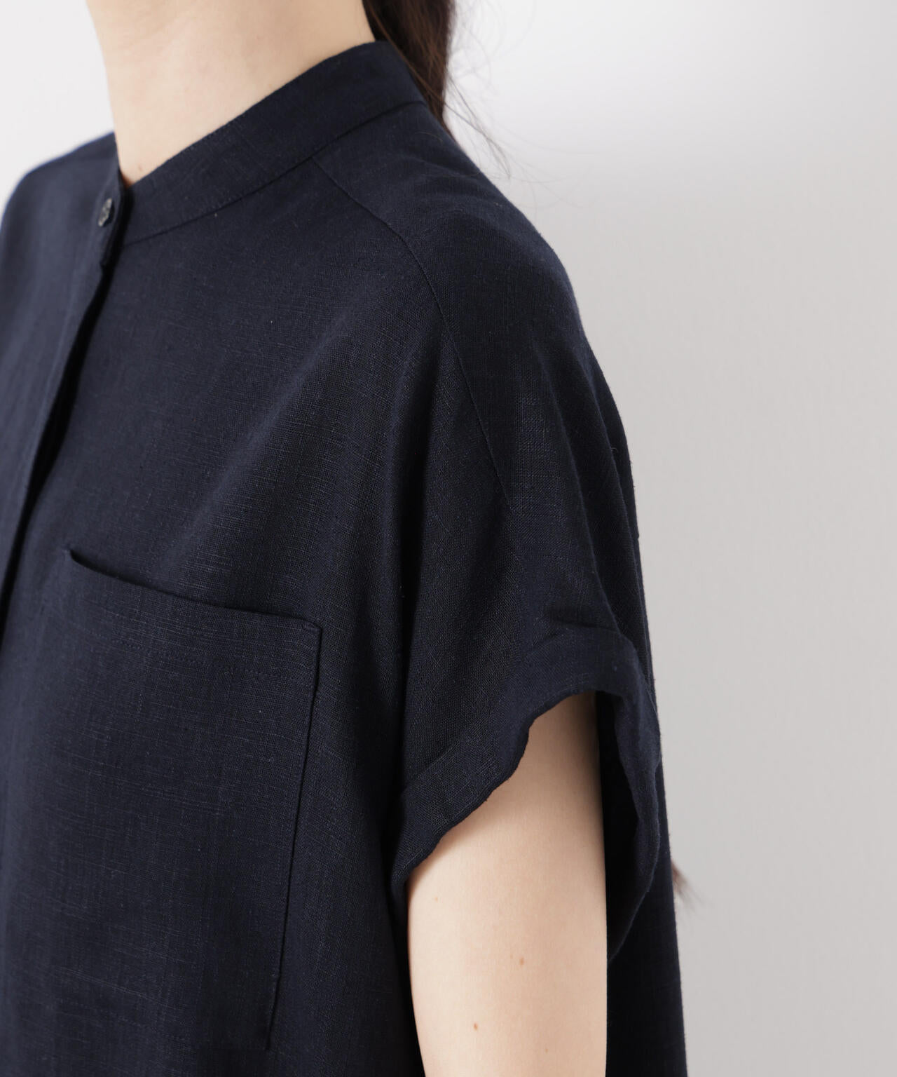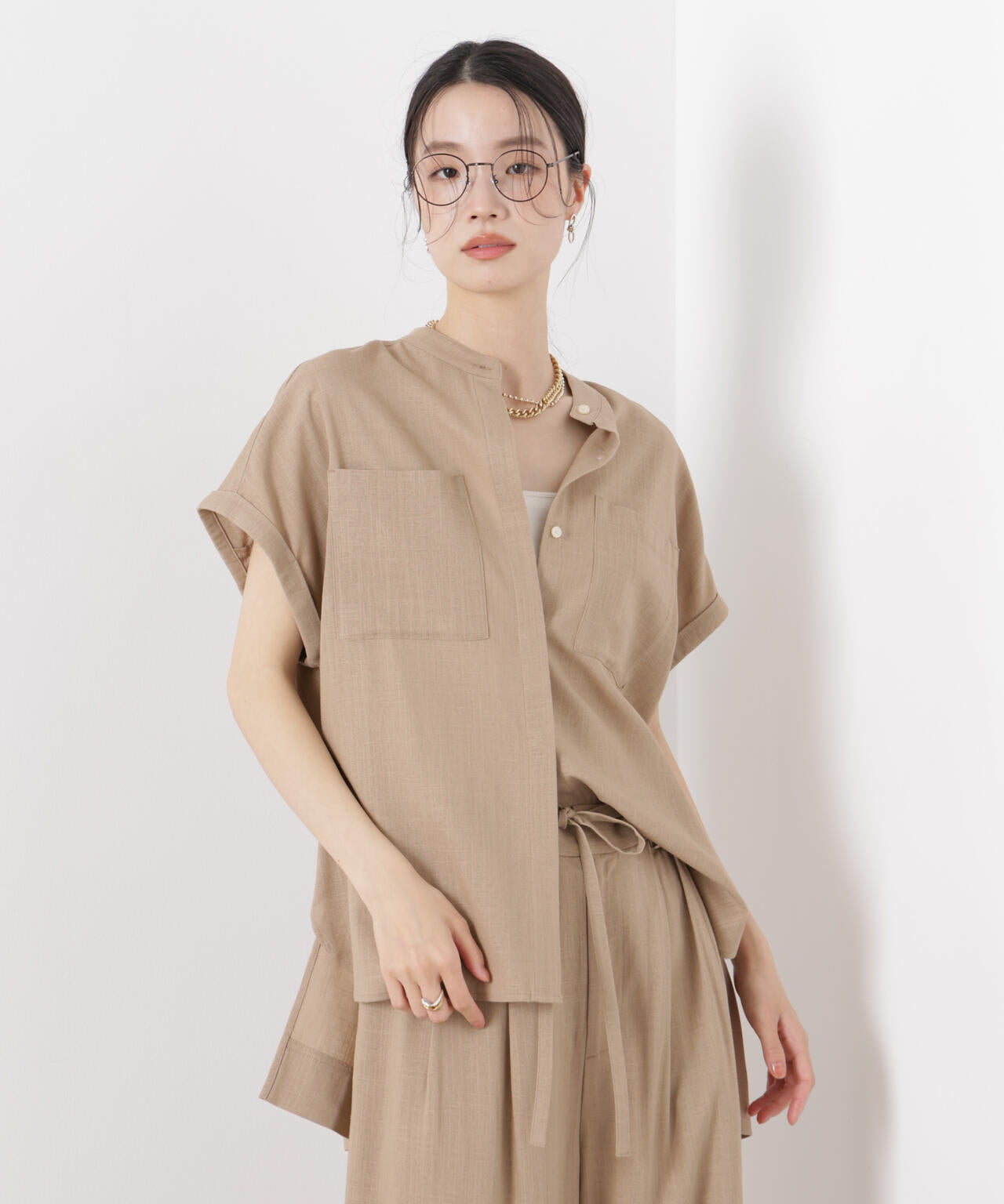 多機能リネン混スタンドカラードルマンフレンチスリーブシャツ(セットアップ可)