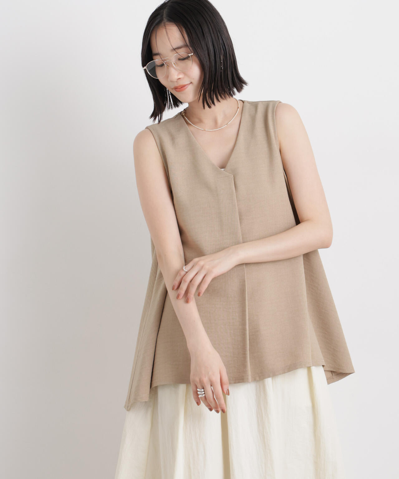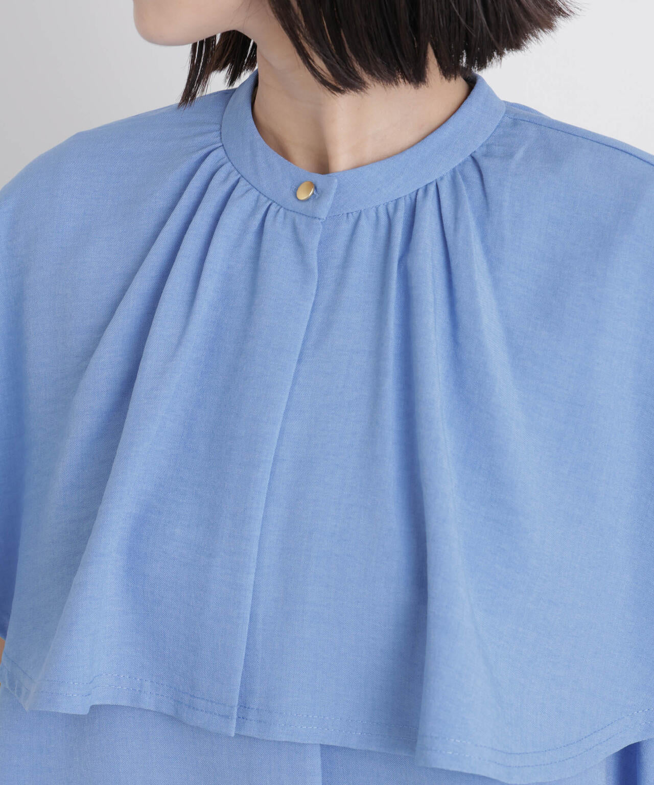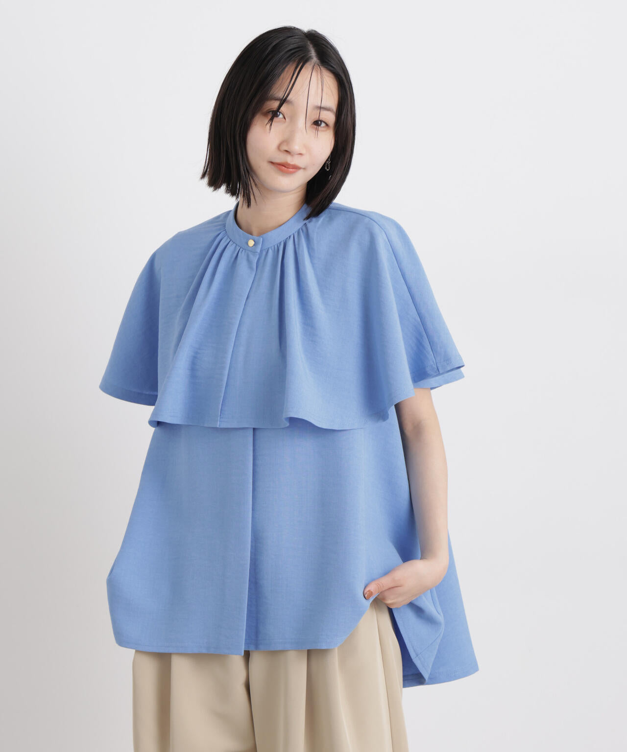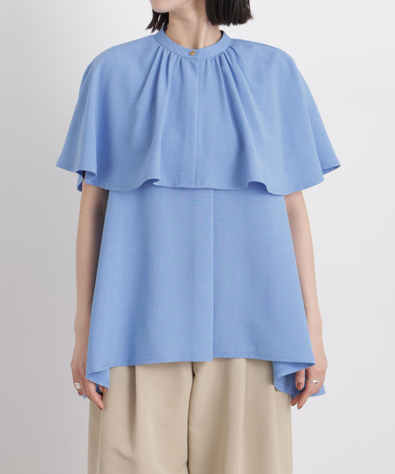 目を惹くケープカラーが首元を華やかに見せてくれるデザインブラウス。衿を取り外してノースリーブブラウスとしても着回せて、雰囲気のチェンジを楽しめるアイテムです。