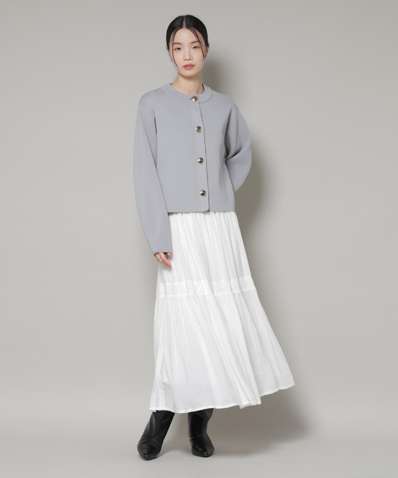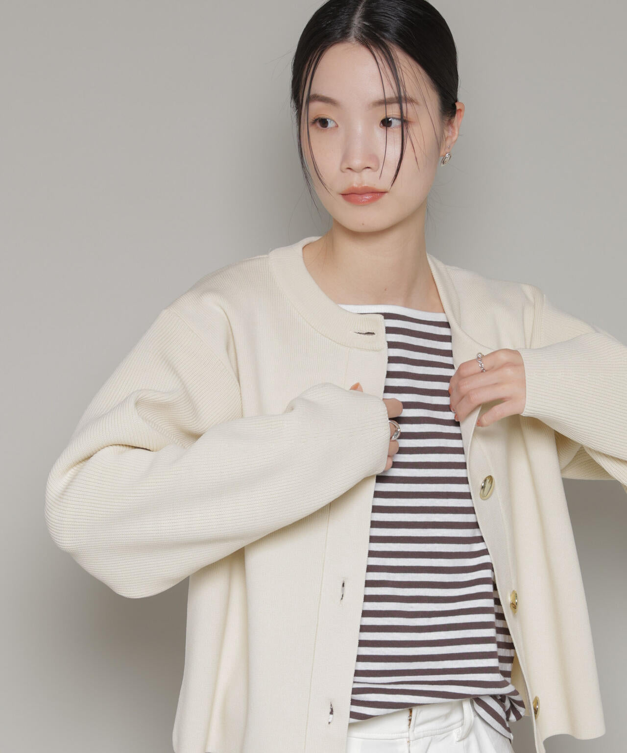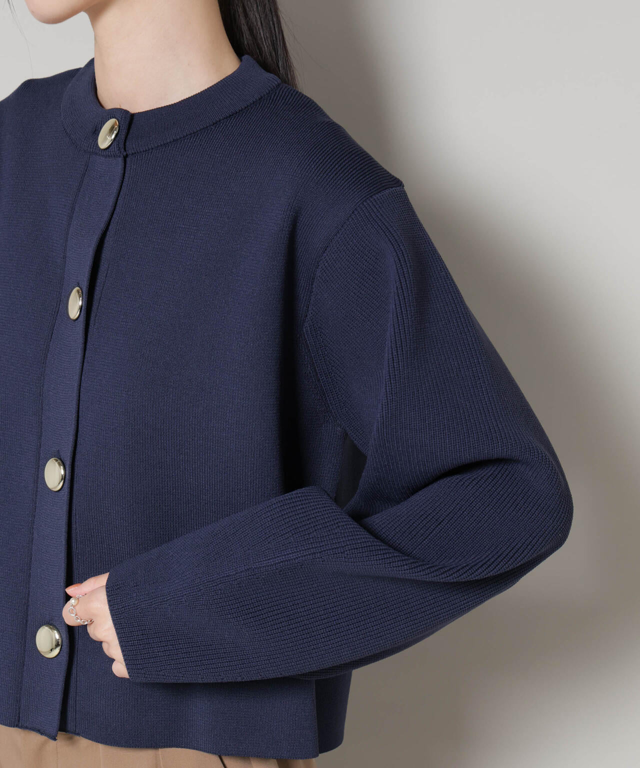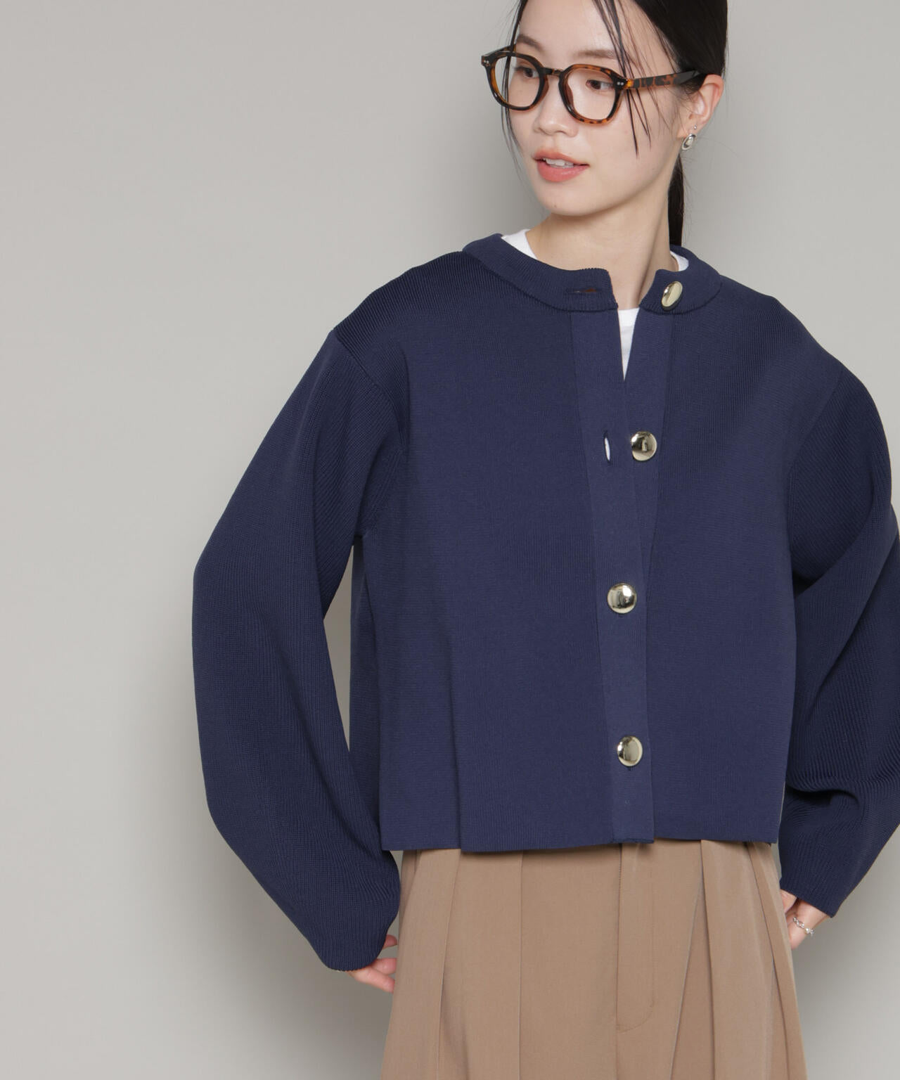 スタイリングのポイントになる大きめのゴールド釦が目を引くニットカーディガン。程よくワイドなやや着丈が短めのボックスシルエットで、ボトムと合わせやすいサイズ感もポイント。春先までプルオーバーとしても、羽織りとしても重宝する一着です。