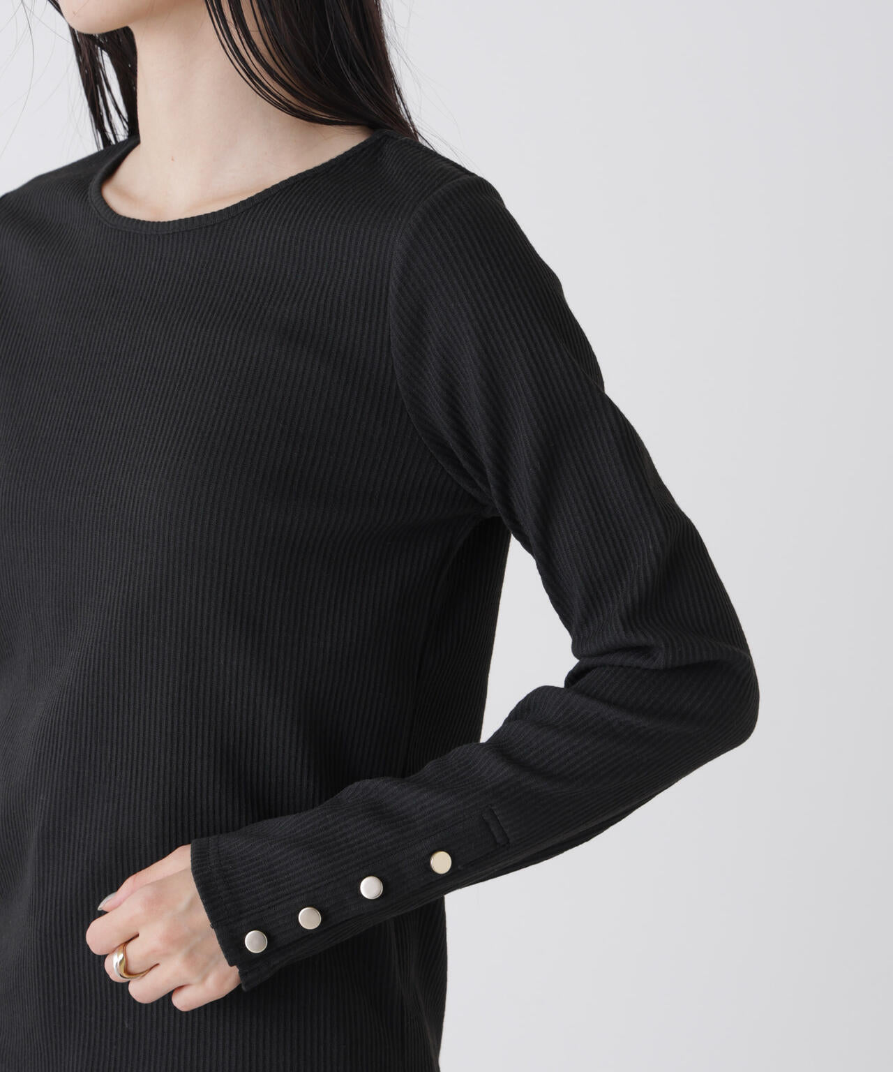 シンプルな中に袖口のゴールドボタンが華やぎを効かせるカットソー