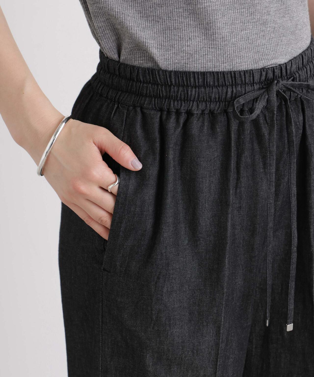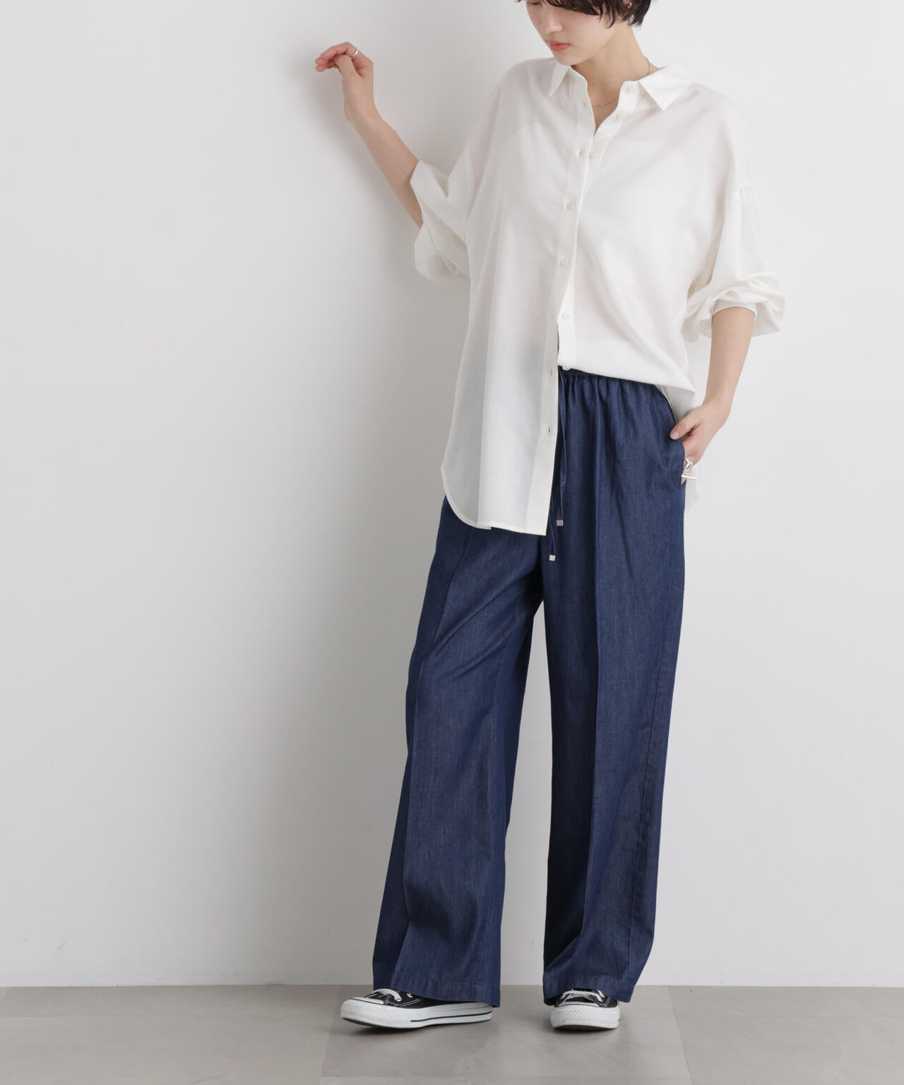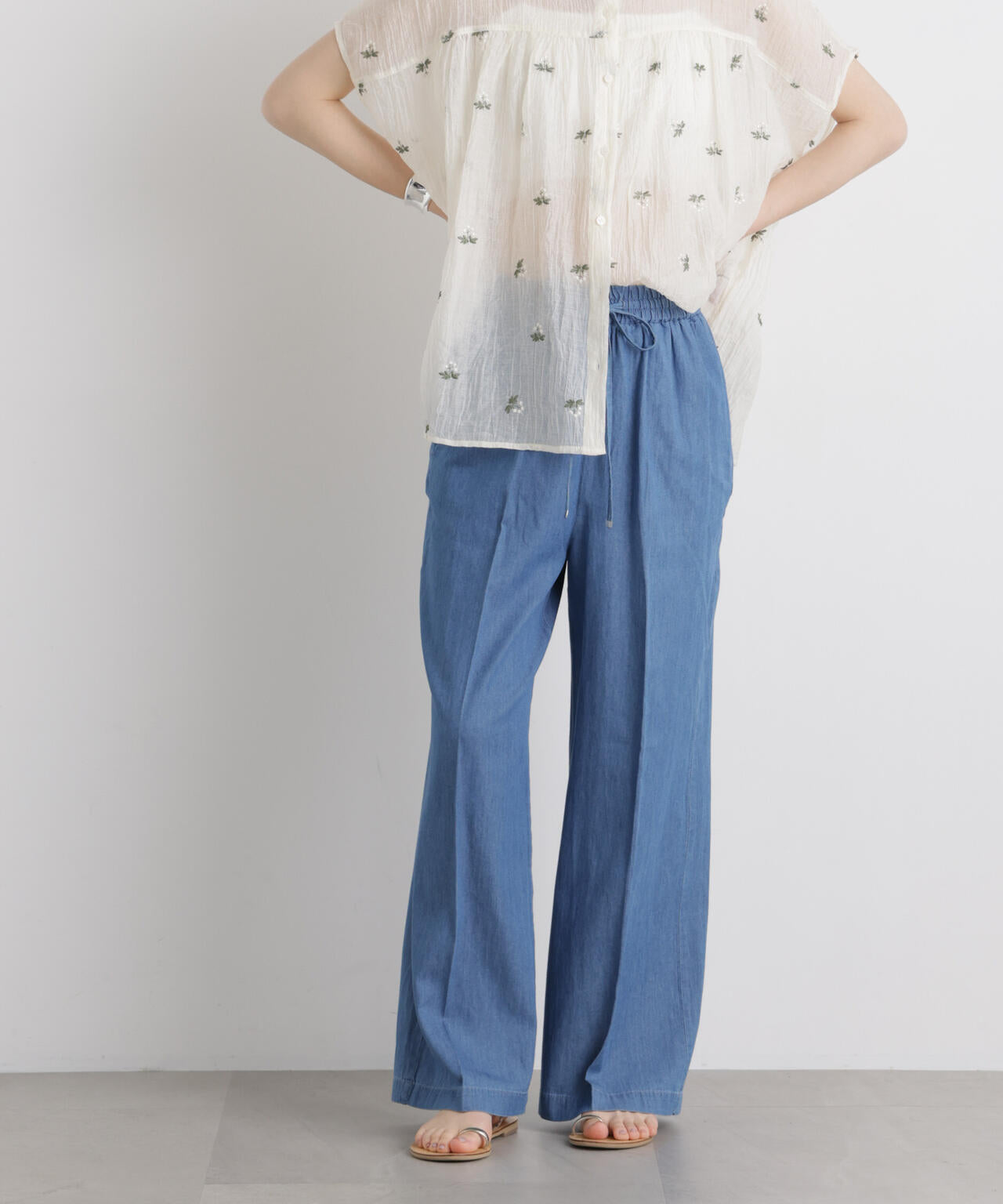 着心地の良い抜け感のあるデニム素材のパンツ。ややワイドなシルエットで、センタープレスも入っているのでカジュアル過ぎずON/OFFで合わせやすいデザイン◎リラックス感のあるウエストゴムで快適な着心地を楽しめるのも魅力です。
