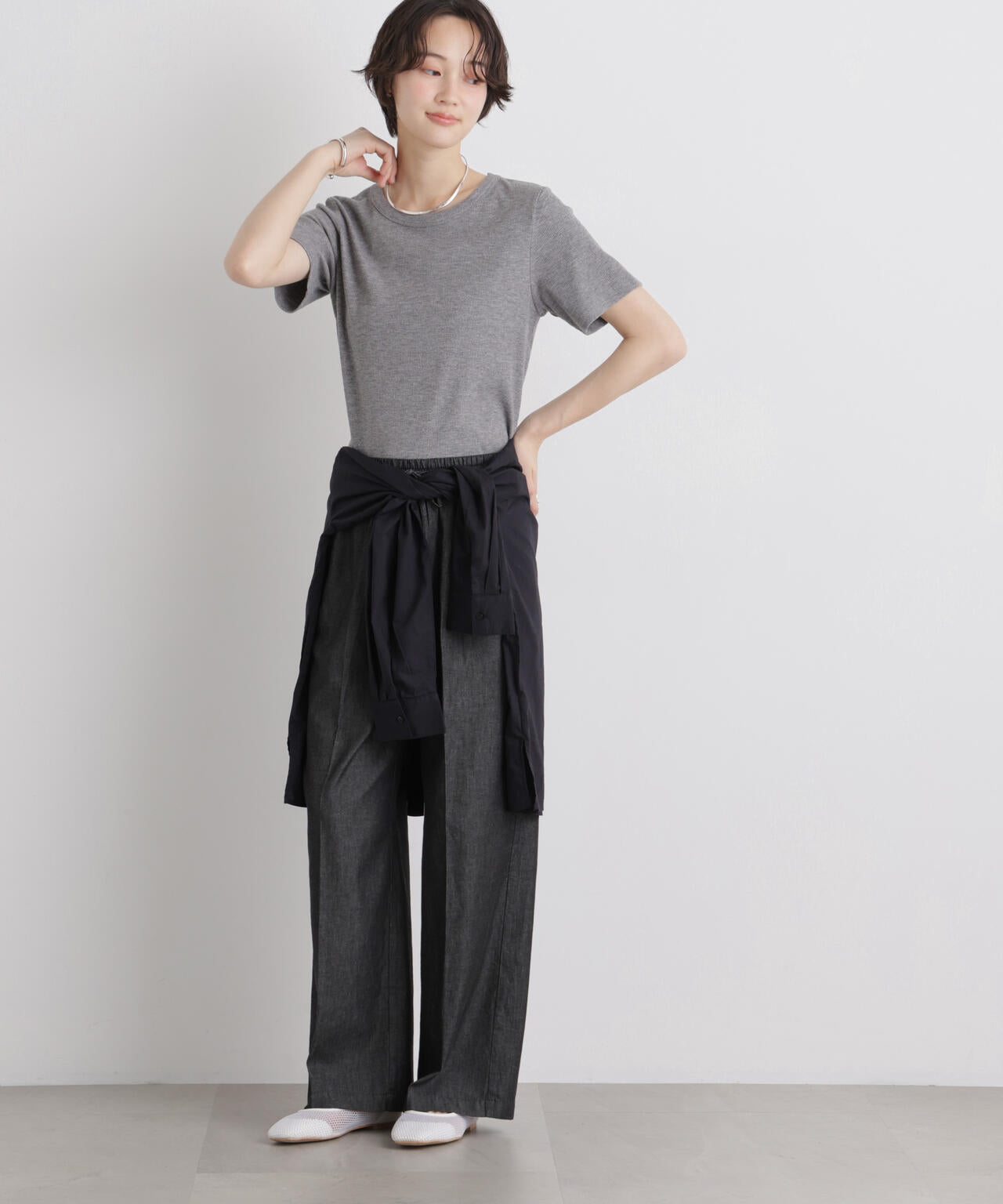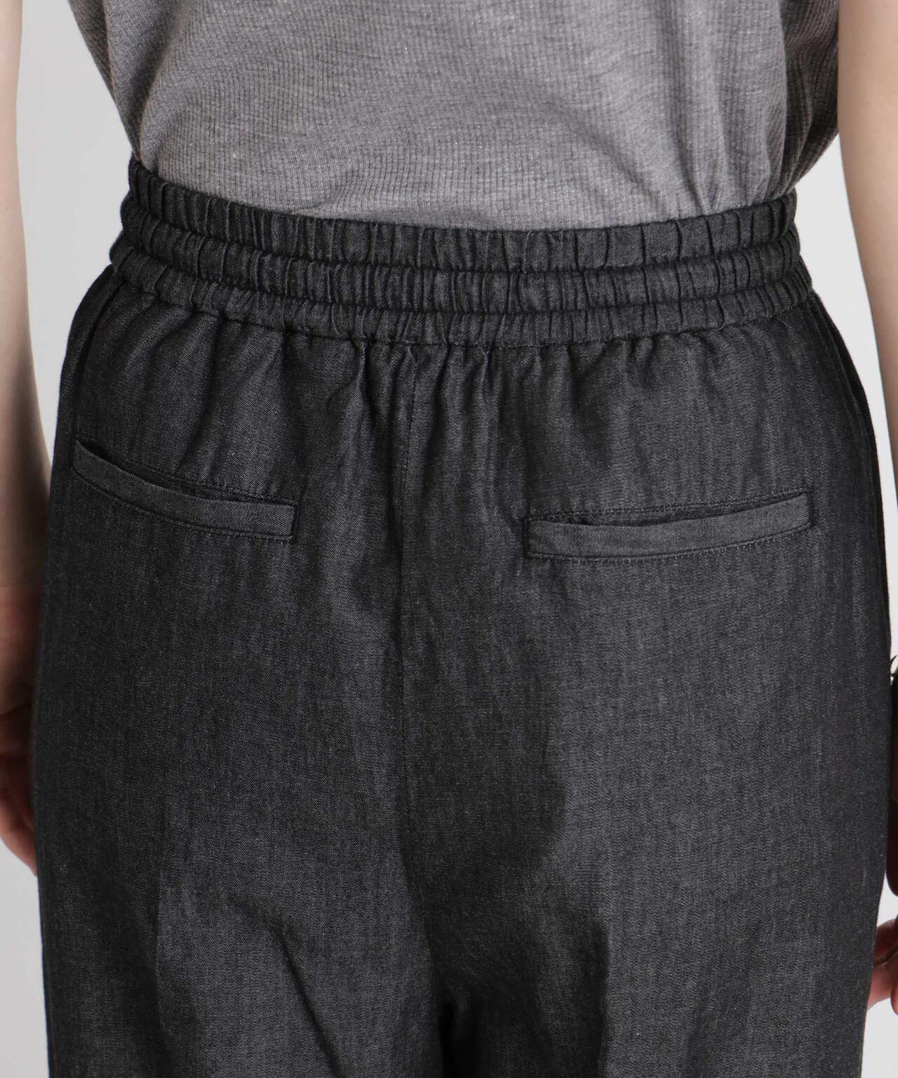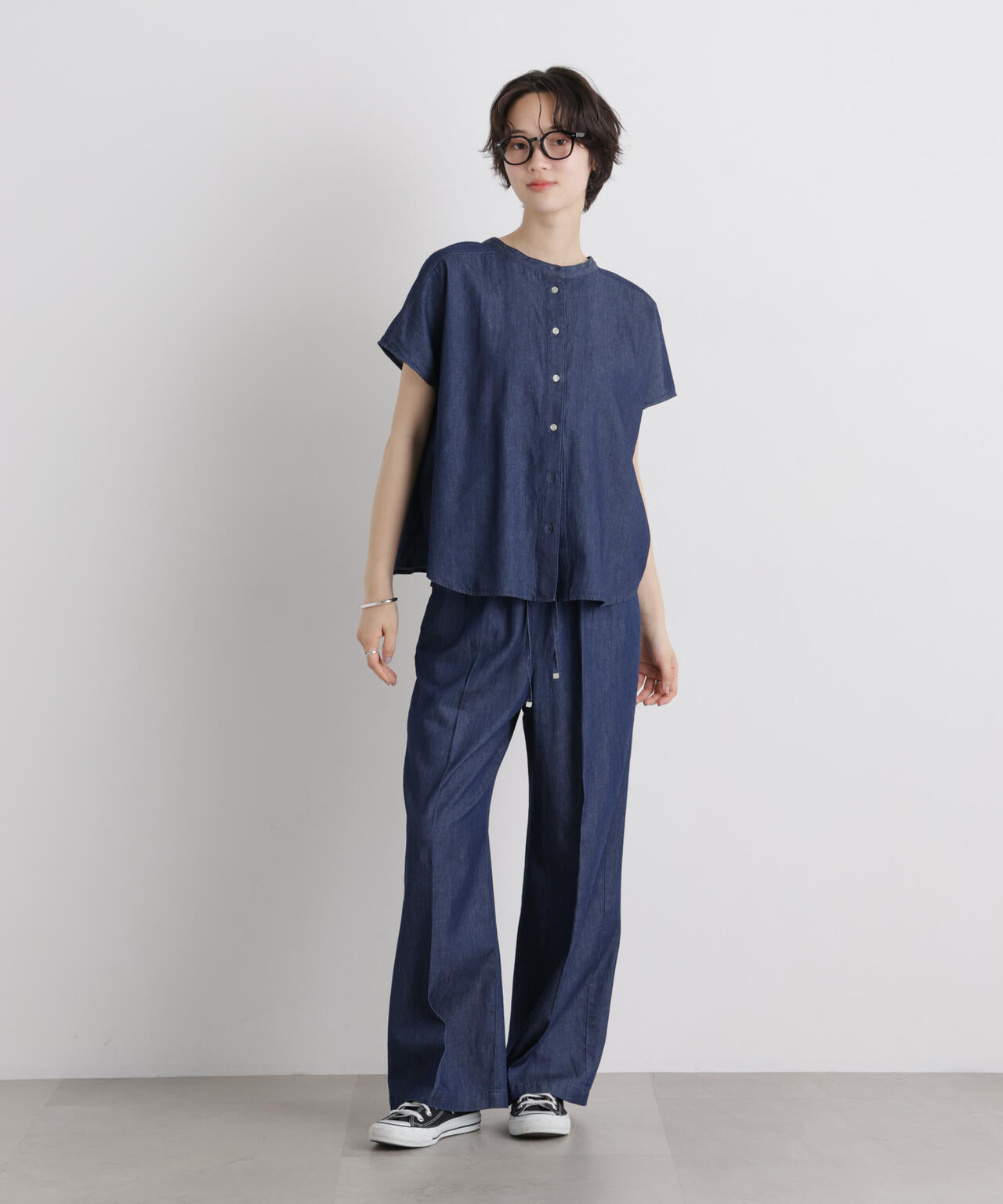 着心地の良い抜け感のあるデニム素材のパンツ。ややワイドなシルエットで、センタープレスも入っているのでカジュアル過ぎずON/OFFで合わせやすいデザイン◎リラックス感のあるウエストゴムで快適な着心地を楽しめるのも魅力です。