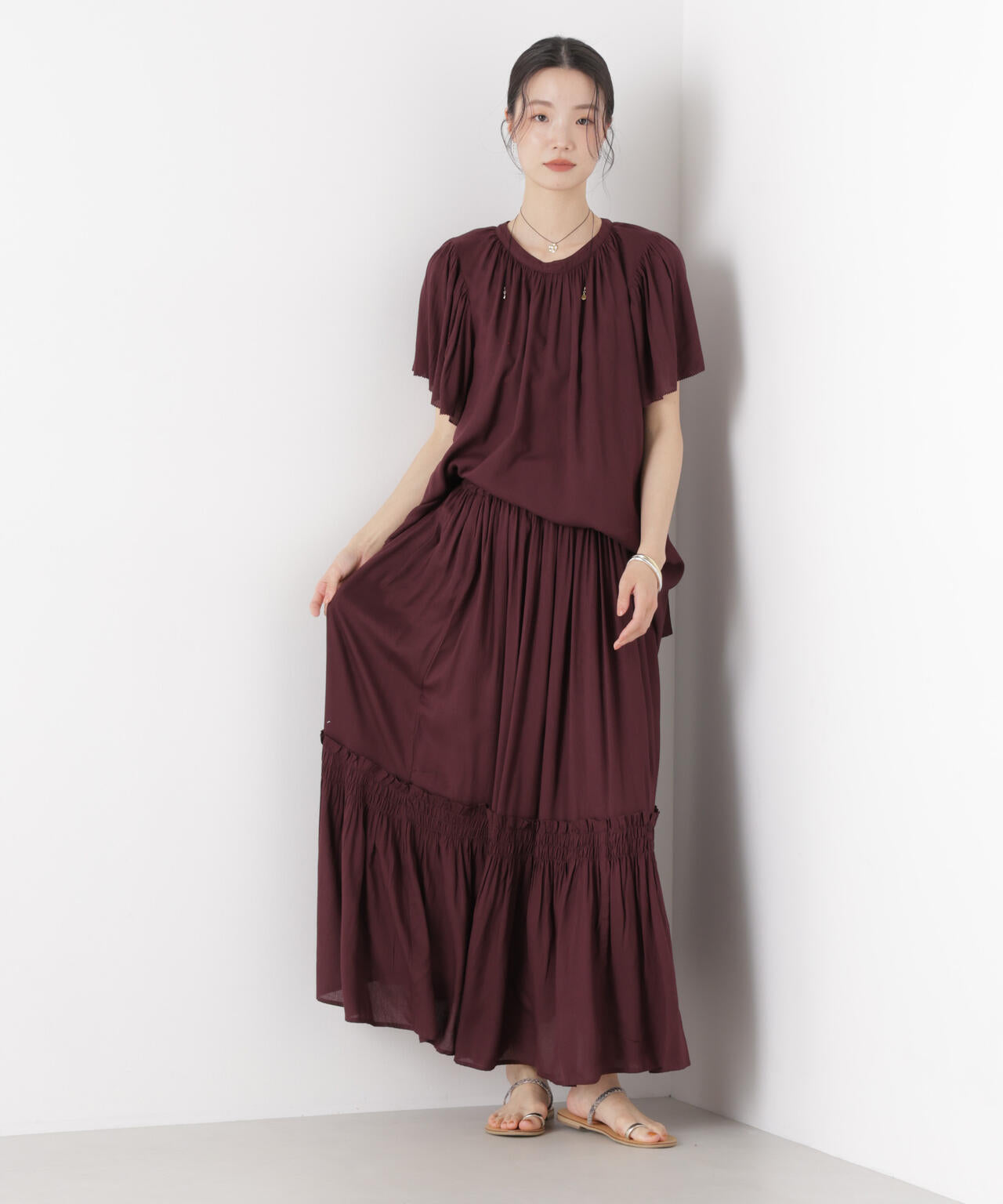 華やかさのある細かいギャザーディティールで切り替えたロングスカート。動くたびに、ふわっと揺れるシルエットが華やかな印象の一着。同素材展開のブラウスとのセットアップスタイルもおすすめです。