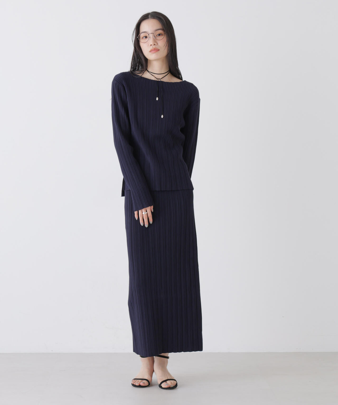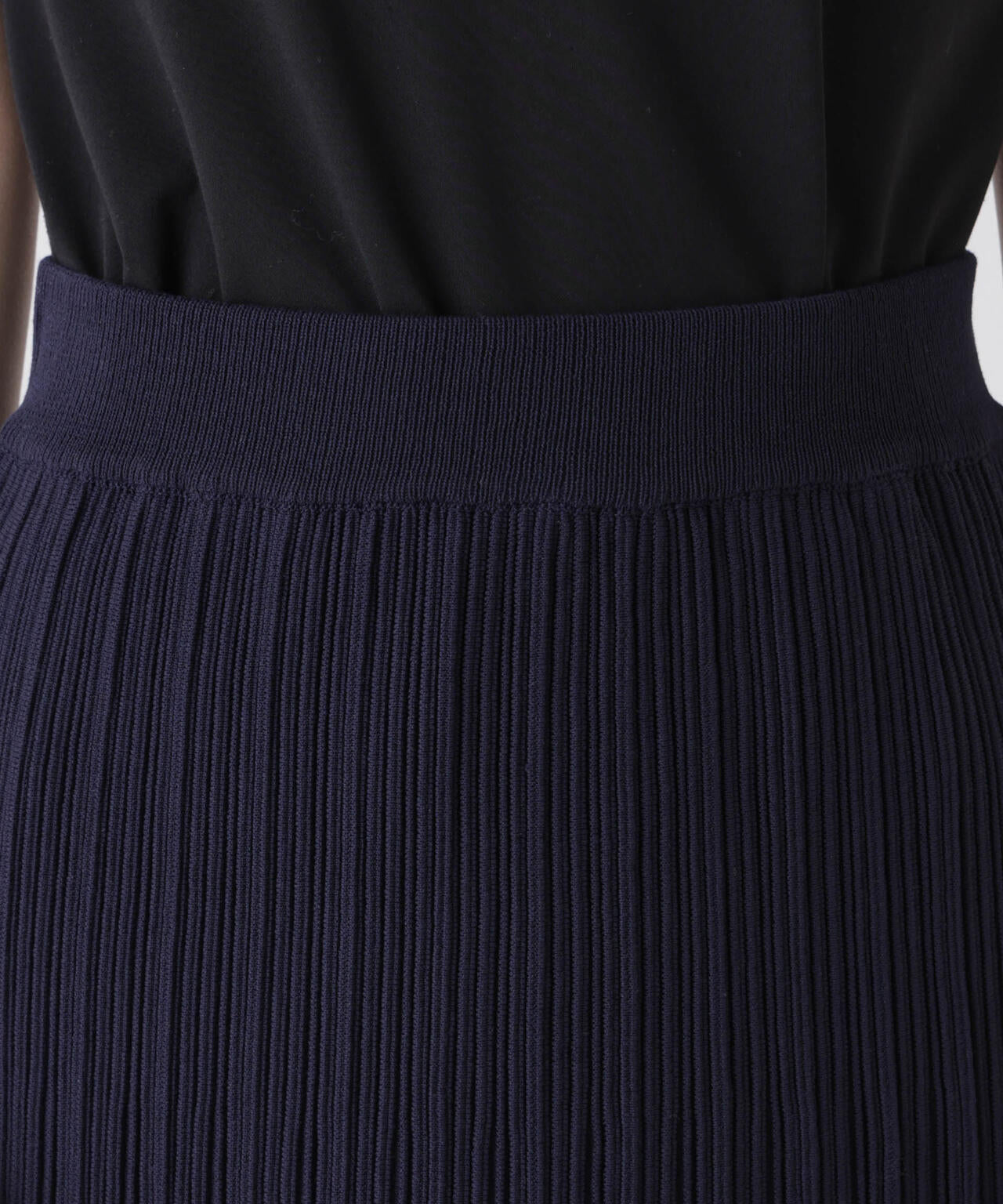 立体的なプリーツリブと、Iラインシルエットが特徴のニットタイトスカート
