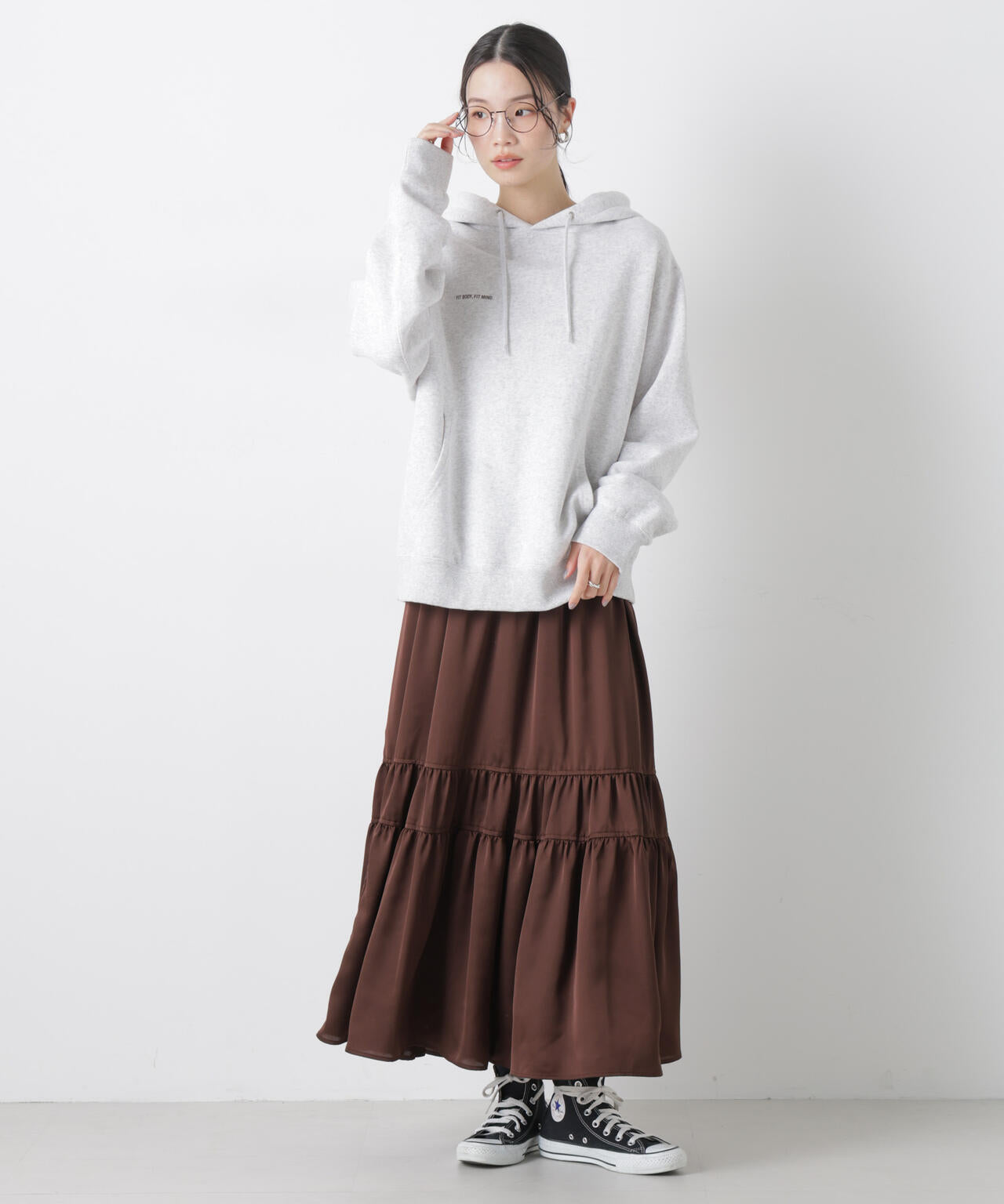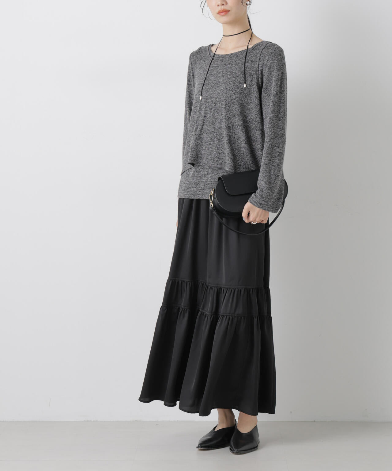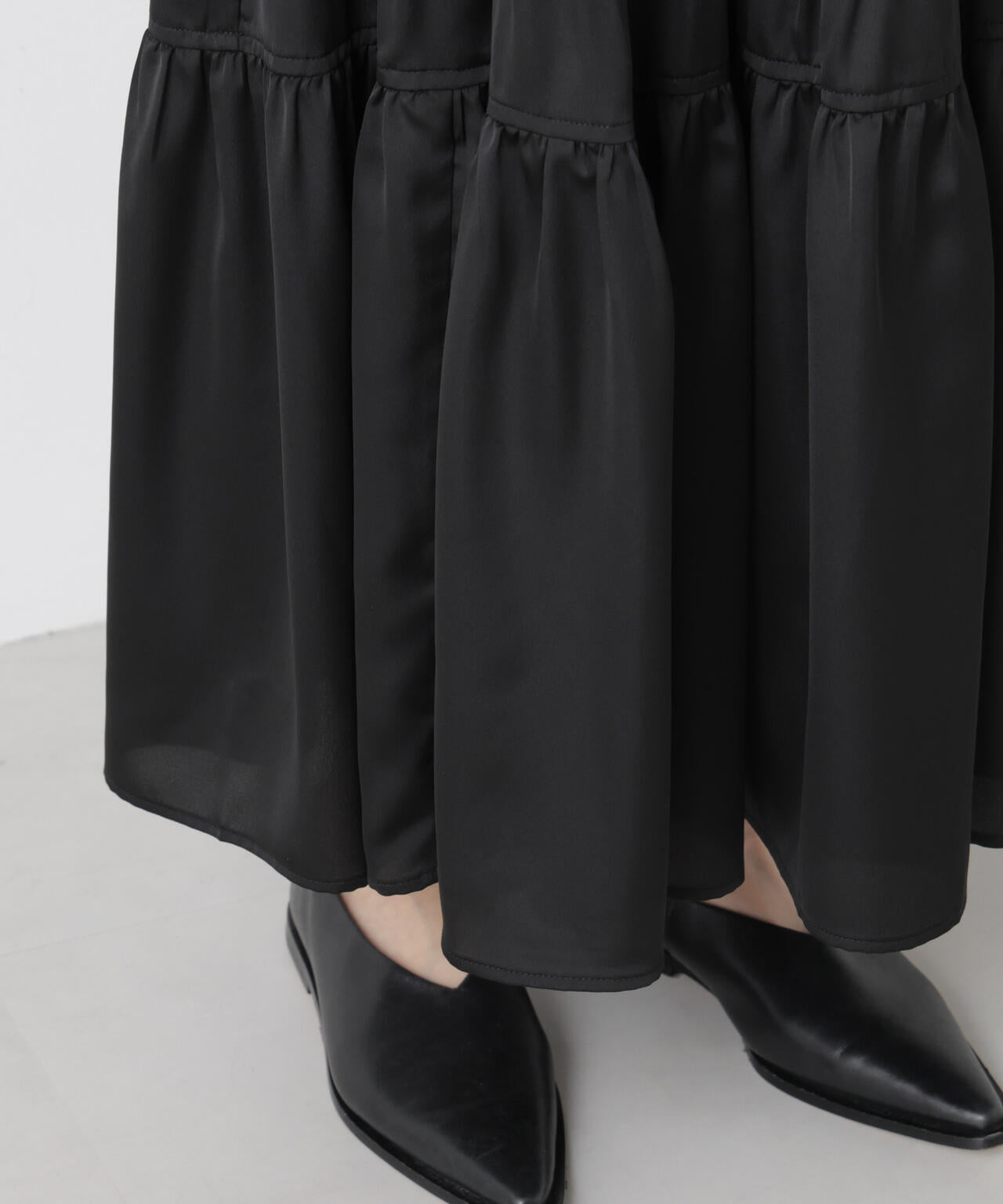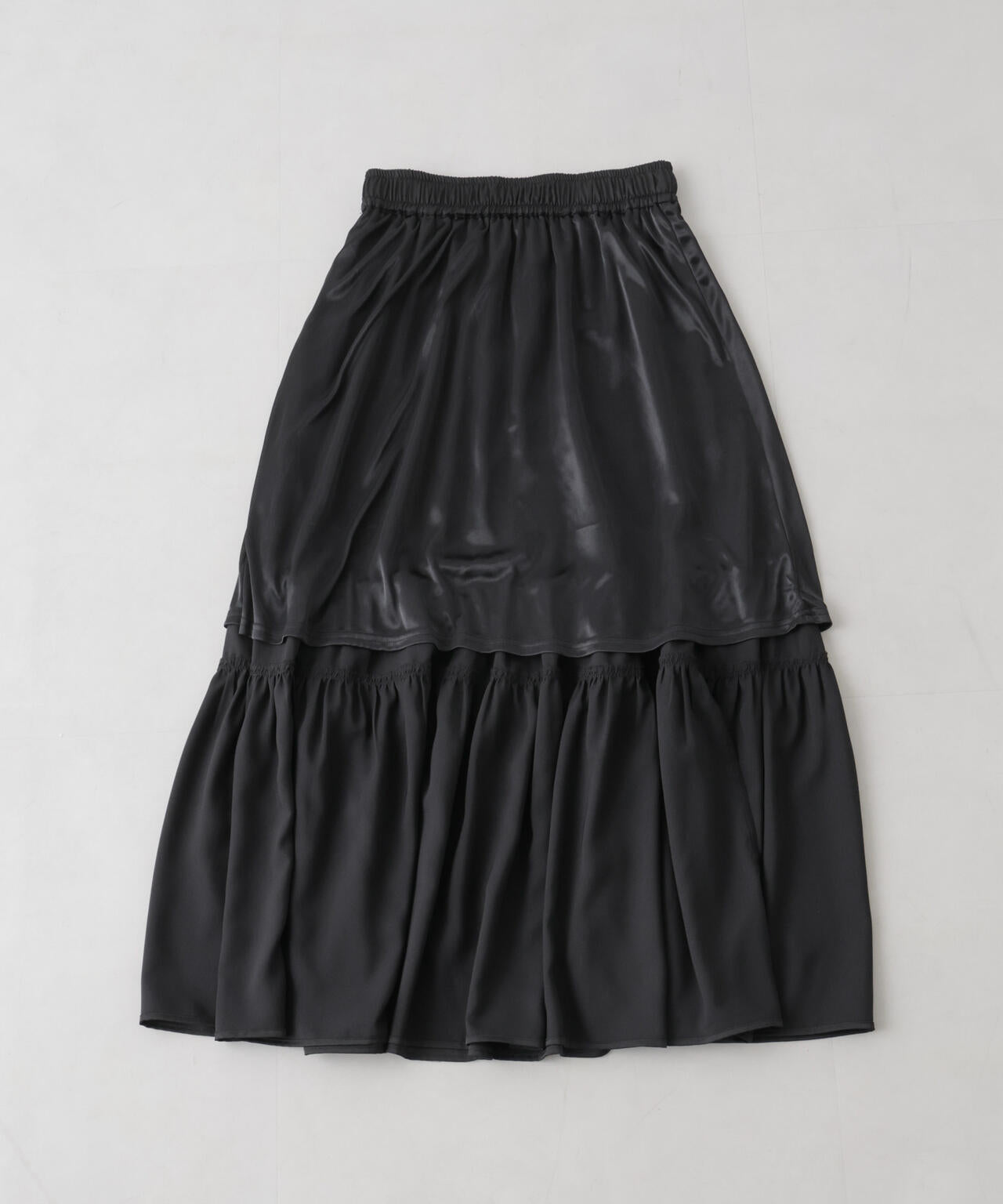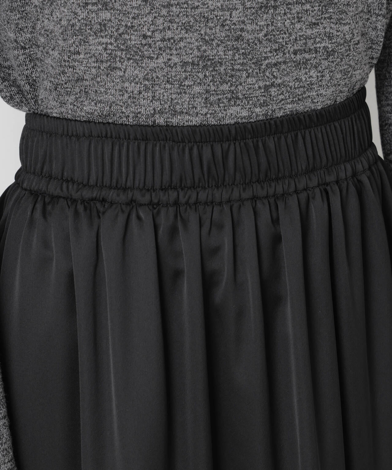 上品なサテンの光沢感と、たっぷり入ったギャザーがさりげない大人フェミニンな雰囲気のロングスカート